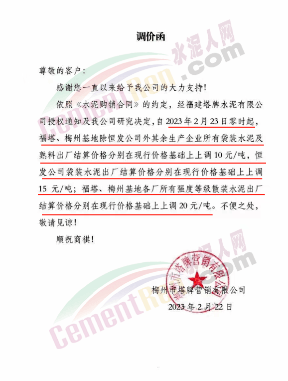 梅州市塔牌營銷有限公司通知,經福建塔牌水泥有限公司授權通知及公司研究決定,自2023年2月23日零時起福塔、梅州基地除恒發公司外其余生產企業所有袋裝水泥及熟料出廠結算價格分別在現行價格基礎上上調10元/噸,恒發公司袋裝水泥出廠結算價格分別在現行價格基礎上上調15元/噸;福塔、梅州基地各廠所有強度等級散裝水泥出廠結算價格分別在現行價格基礎上上調20元/噸。