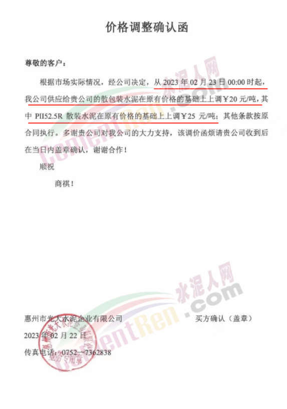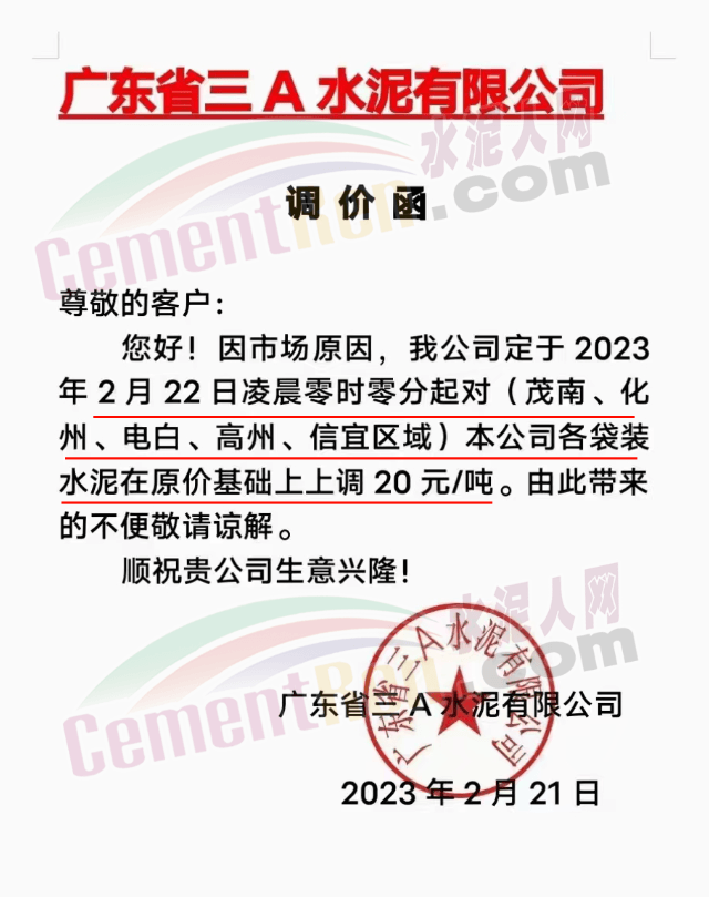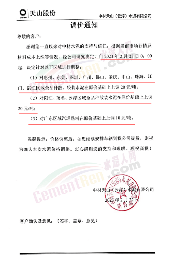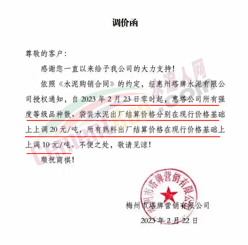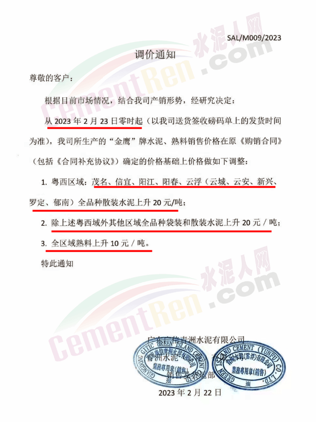 中材亨達水泥有限公司通知,根據當前市場行情及材料成本上漲等情況,經公司研究決定,自2023年2月23日0時起: 對惠州、東莞、深圳、廣州、佛山、肇慶、中山、珠海、江門、湛江區域全品種散、袋裝水泥在原價基礎上上調 20 元/噸;對陽江、茂名、云浮區域全品種散裝水泥在原價基礎上上調20 元/噸;對廣東區域汽運熟料在原價基礎上上調10元/噸。