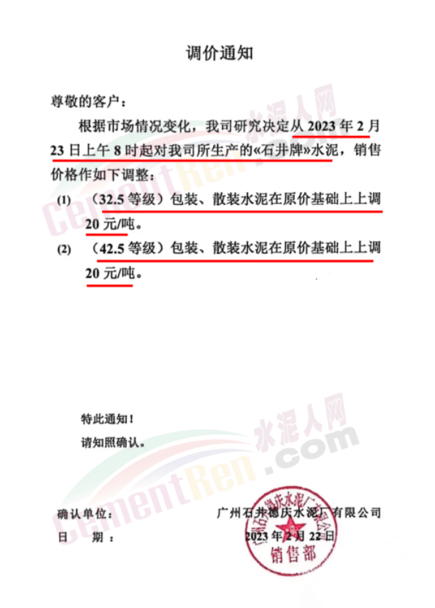 廣州石井水泥、石井德慶水泥通知從2023年2月23日上午8時起,水泥價格上調20元/噸。