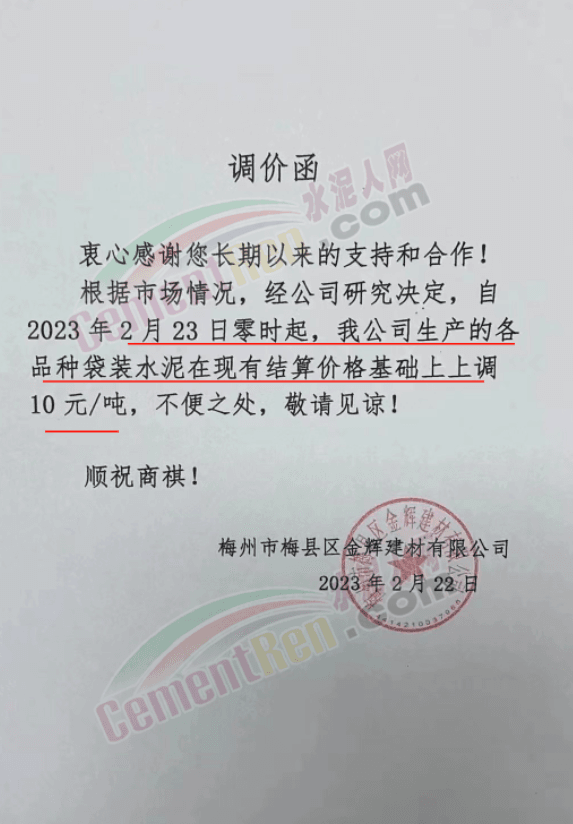 梅州市梅縣區永盛建材有限公司通知,2月23日零時起,所有水泥上調10元/噸。