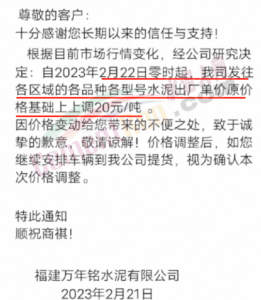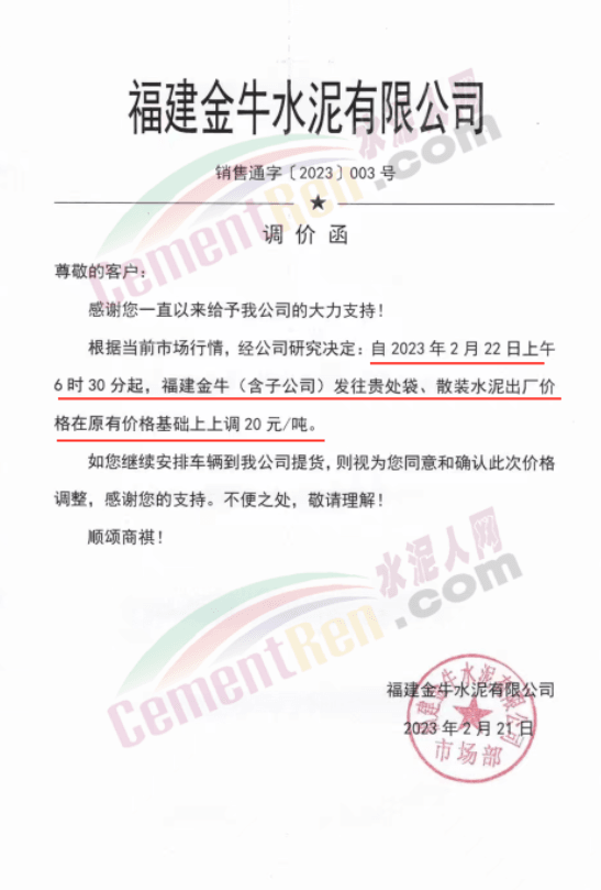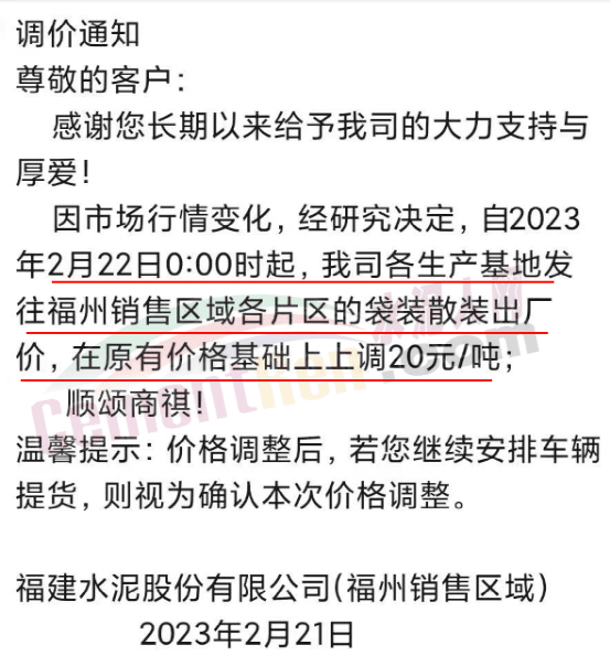 福建龍麟集團通知自2023年2月22日零時起,公司發往福建區域各規格型號袋裝、散裝水泥以及熟料,在原價格基礎上每噸上調20元/噸。