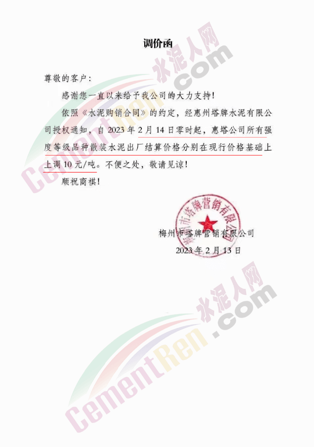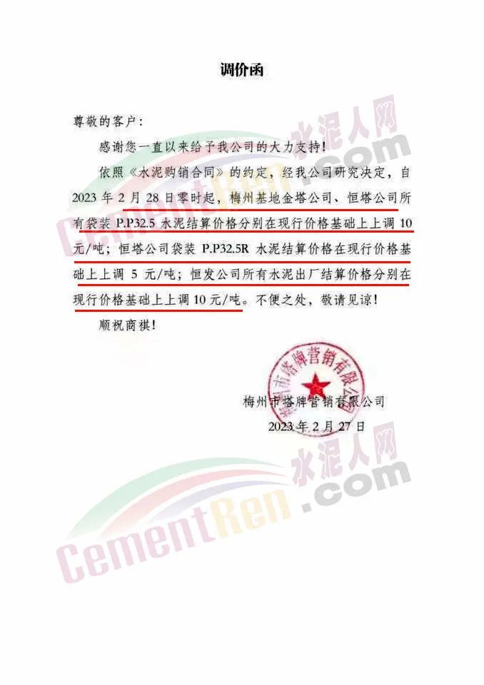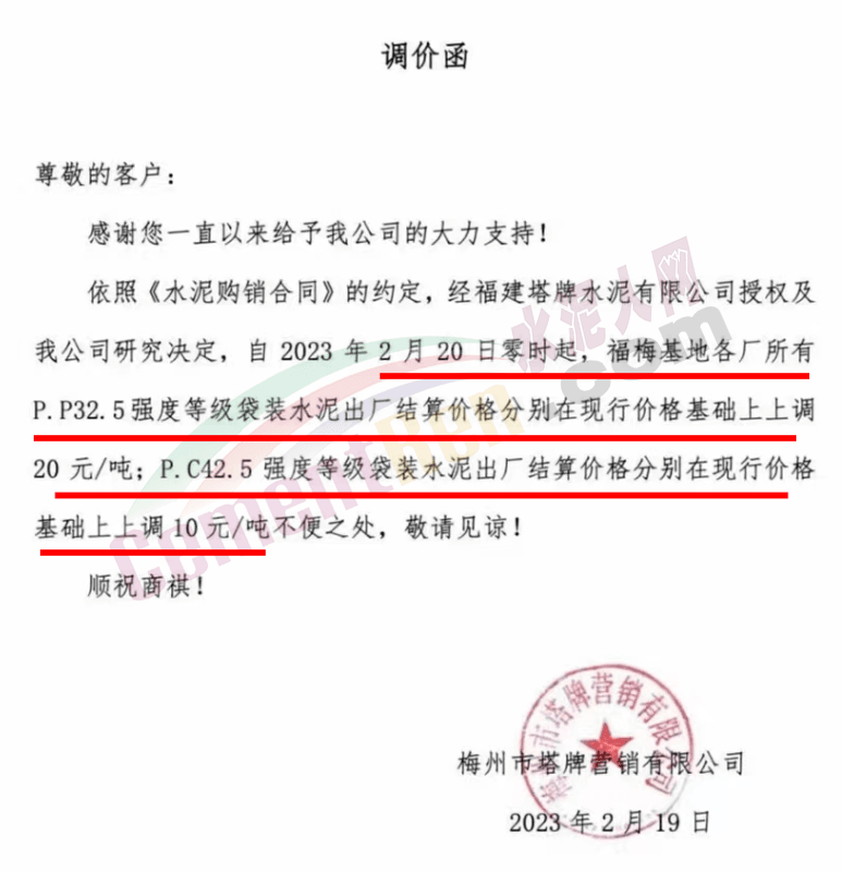 水泥人網通訊員消息,日前梅州市塔牌管銷有限公司通知,自2023年2月28日零時起,梅州基地金塔公司、恒塔公司所有袋裝PP325水泥結算價格分別在現行價格基礎上上調10元/噸;恒塔公司袋裝PP32.5R水泥結算價格在現行價格基礎上上調5元/噸;恒發公司所有水泥出廠結算價格分別在現行價格基礎上上調10元/噸。
