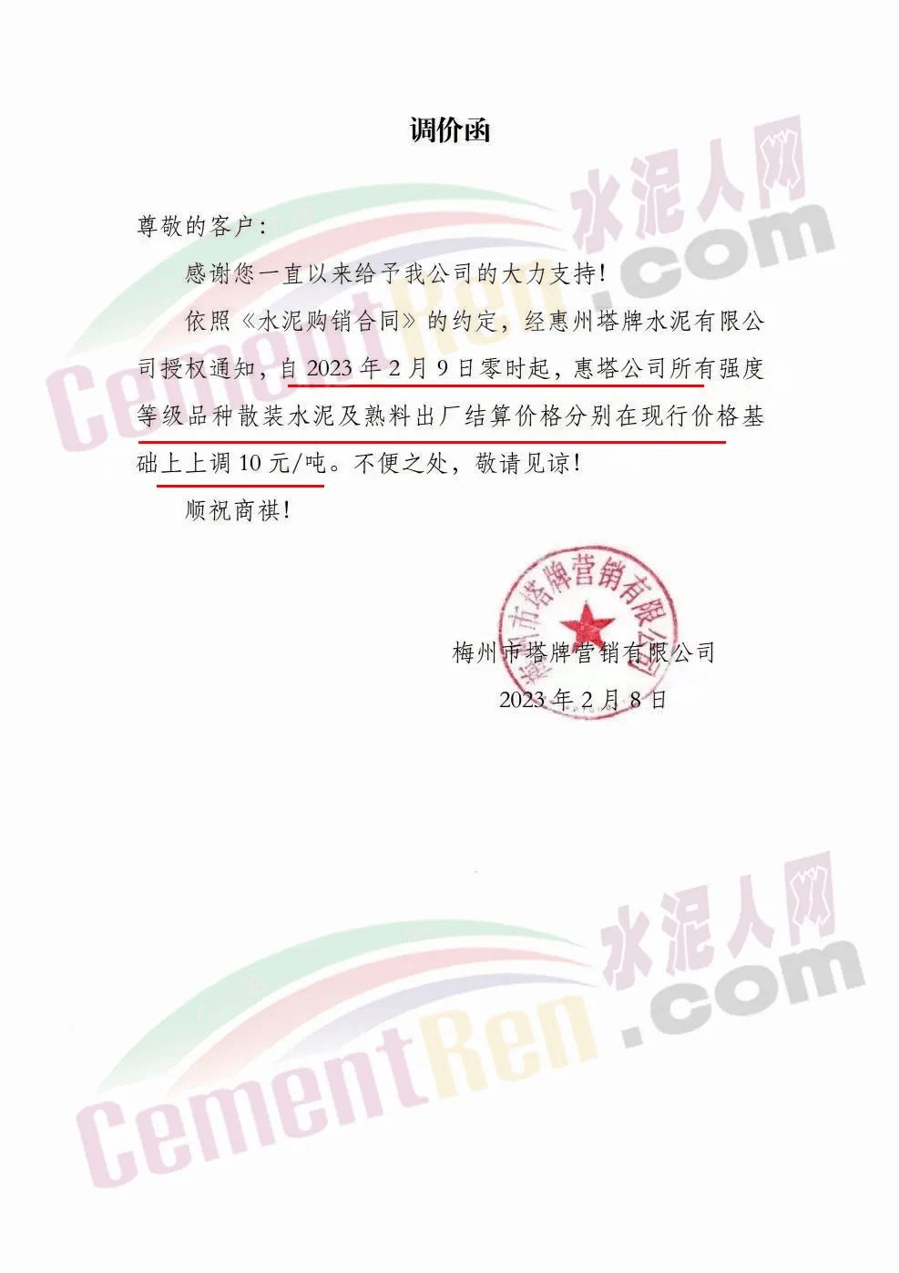 據水泥人網信息中心數據,2月內塔牌水泥已經陸續發出近10份漲價函。