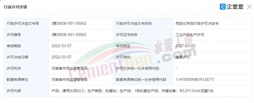 企業(yè)生產(chǎn)許可證編號(hào):(豫)XK08-001-00062,有效期至2027年3月25日。產(chǎn)品為通用水泥42.5;生產(chǎn)類型為粉磨站;擁有一條粉磨生產(chǎn)線;關(guān)鍵設(shè)備為Ф3.2╳13m水泥磨1臺(tái)。