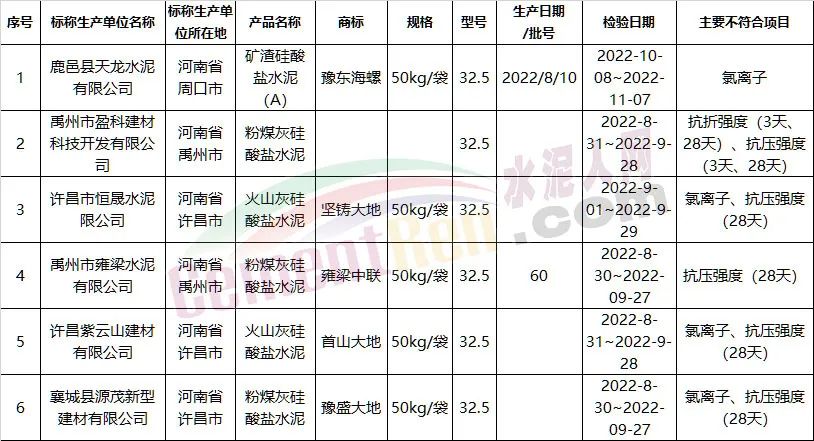 不合格品抽檢產(chǎn)品分別為礦渣硅酸鹽水泥(A)、粉煤灰硅酸鹽水泥、火山灰硅酸鹽水泥;標(biāo)稱單位分別為鹿邑縣天龍水泥有限公司、禹州市盈科建材科技開發(fā)有限公司、許昌市恒晟水泥有限公司、禹州市雍梁水泥有限公司、許昌紫云山建材有限公司、襄城縣源茂新型建材有限公司,主要不符合項(xiàng)目為氯離子、抗壓,抗折強(qiáng)度。不合格品商標(biāo)分別為豫東海螺、堅(jiān)鑄大地、雍梁中聯(lián)、首山大地、豫盛大地。