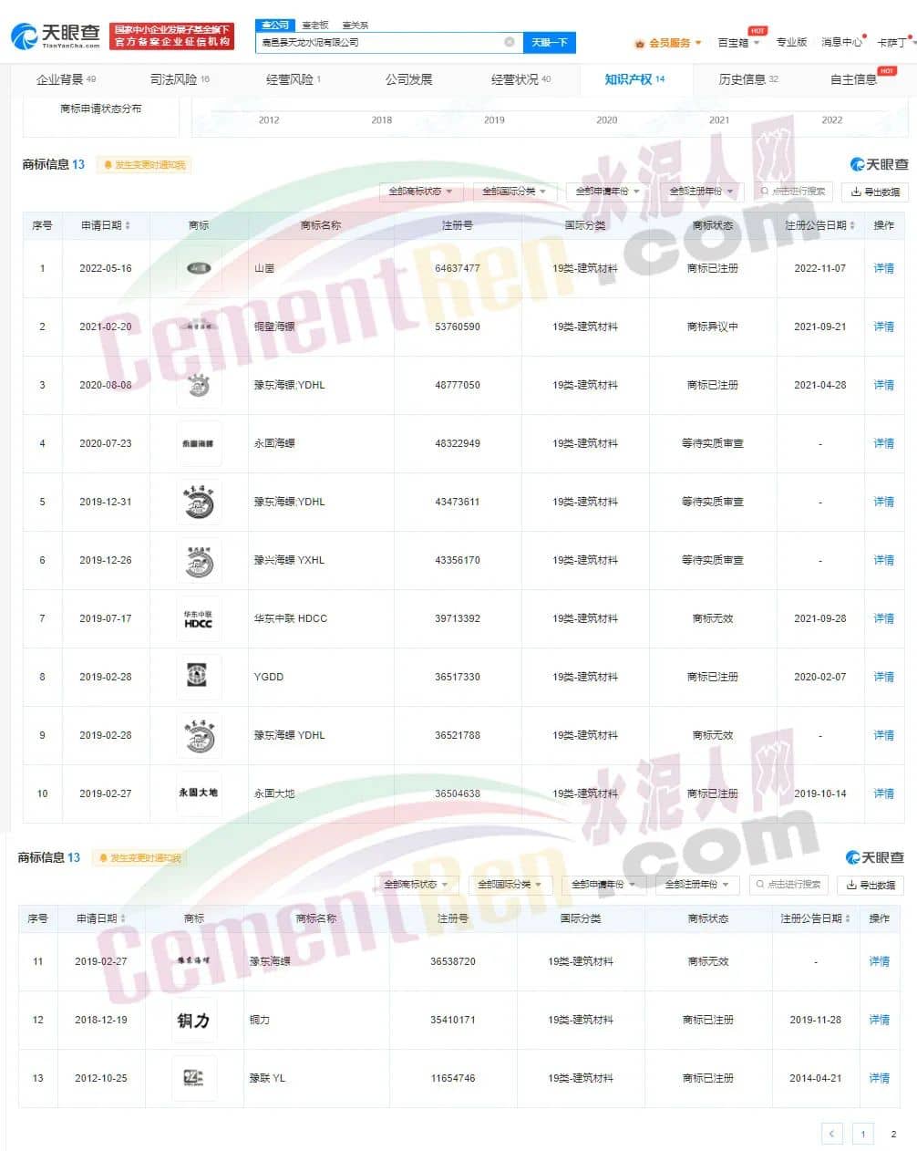 水泥人網(wǎng)注意到,鹿邑縣天龍水泥有限公司旗下共有13條注冊(cè)商標(biāo)信息,其中“豫東海螺”相關(guān)兩條為無效商標(biāo),一條為等待實(shí)質(zhì)審查階段。另有一條為“豫東海鏍”信息已注冊(cè)。