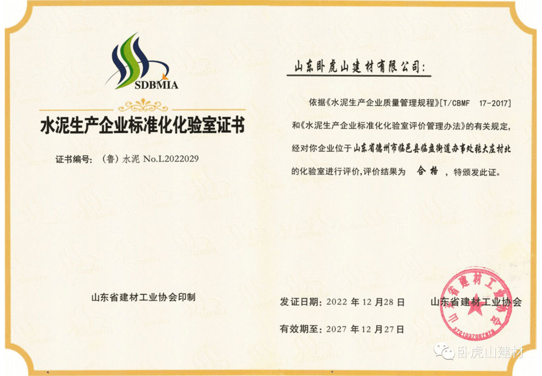多年來,臥虎山建材出品水泥在省、市化驗室的檢驗結(jié)果都是業(yè)內(nèi)佼佼者,憑借強大的技術(shù)力量、先進的生產(chǎn)設備、可靠的原料質(zhì)量和過硬的產(chǎn)品質(zhì)量,臥虎山建材先后獲得全省水泥生產(chǎn)企業(yè)標準化化驗室證書、全省2022年水泥物理檢驗和化學分析大對比全合格單位等榮譽稱號。