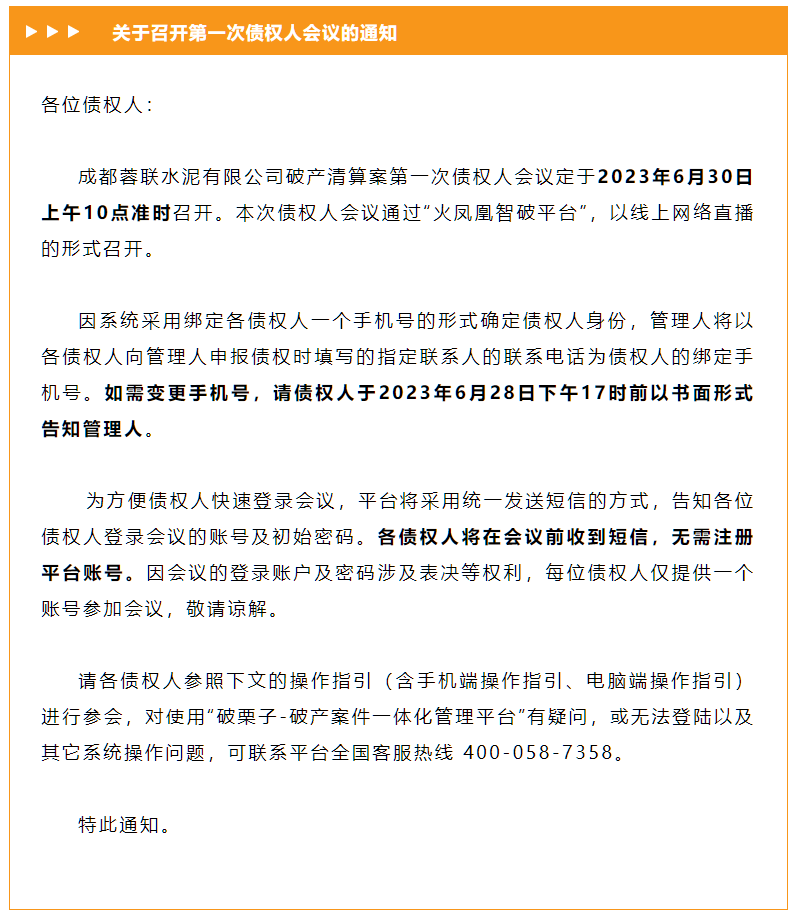 6月21日,雙流法院微發(fā)布微信公眾號發(fā)布《成都蓉聯(lián)水泥有限公司破產(chǎn)清算案第一次債權(quán)人會議通知及操作指引》提到,成都蓉聯(lián)水泥有限公司破產(chǎn)清算案第一次債權(quán)人會議定于2023年6月30日上午10點準時召開。