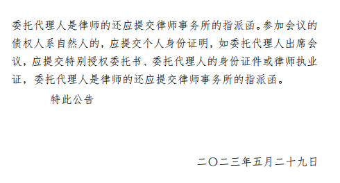參加會議的債權(quán)人是法人或其他組織的,應(yīng)當提供營業(yè)執(zhí)照、法定代表人或負責(zé)人身份證明書,如委托代理人參加的,還應(yīng)當提供特別授權(quán)委托書、委托人身份證或律師執(zhí)業(yè)證,委托代理人是律師的還應(yīng)提交律師事務(wù)所的指派函,并于2023年6月28日上午9點20分登錄破易云平臺(方式一:手機微信搜索“破易云”小程序,在登錄頁中輸入手機號、獲取短信驗證碼并輸入案件識別碼:111481,登錄參會;方式二:電腦瀏覽器訪問網(wǎng)址https://zqr.poyiyun.com/ 登錄后參與會議,本案件識別碼:111481)召開德宏州三象通用水泥有限責(zé)任公司強制清算案第一次債權(quán)人正式會議,本次會議開始前管理人將會議文本上傳至破易云平臺,請債權(quán)人及時登陸破易云平臺下載查閱。請各位債權(quán)人準時登錄系統(tǒng),點擊進入債權(quán)人會議,通過網(wǎng)絡(luò)方式參與會議和投票表決。