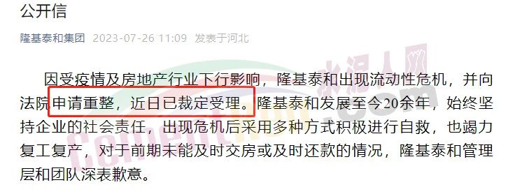 近日,隆基泰和發布公開信,因受疫情及房地產行業下行影響,企業出現流動性危機,并向法院申請重整,近日已裁定受理。其還表示,出現危機后采用多種方式積極進行自救,也竭力復工復產,對于前期未能及時交房或及時還款的情況,隆基泰和管理層和團隊深表歉意。