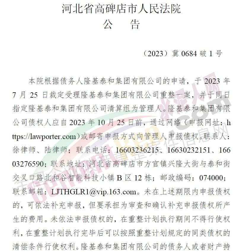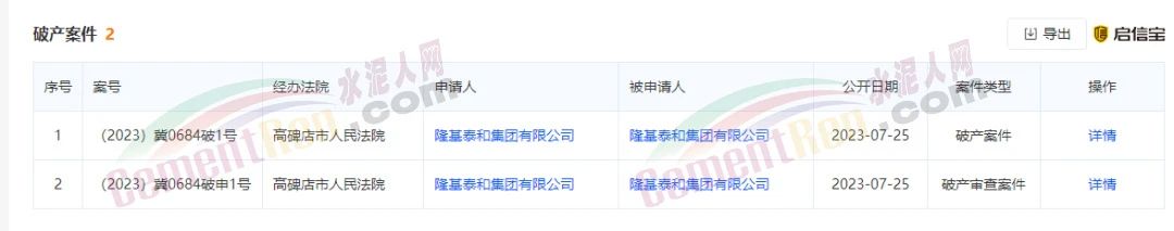 據水泥人網了解,7月25日,隆基泰和集團新增一起破產重整案件,破產重整的申請人和被申請人均為隆基泰和集團,經辦法院為河北高碑店法院。另外,高碑店市人民法院定于2023年11月9日上午9時30分通過網絡會議形式召開第一次債權人會議,依法申報債權的債權人有權參加債權人會議。
