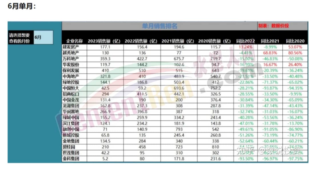 公開數據顯示,今年6月份碧桂園、濱江、新城控股、中鐵建、遠洋等房企的銷售額均同比出現了腰斬,另外招商、華潤、金茂、龍湖、卓越等房企6月銷售額同比的跌幅也都在30%上下,萬科、保利、中海、綠地、華發等房企6月銷售額同比的跌幅也都在20%左右。6月房企實現銷售操盤金額5267.4億元,單月業績同比降低28.1%。