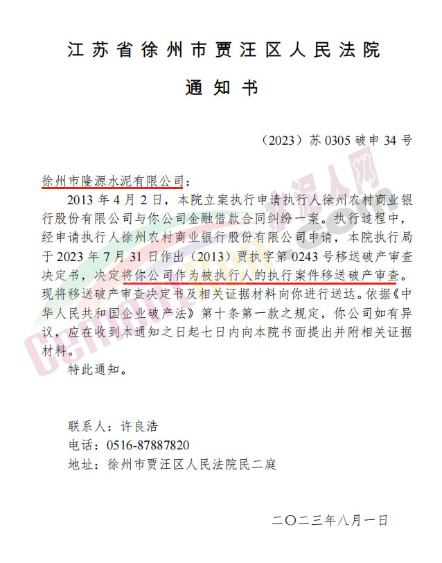 法院執(zhí)行局于2023年7月31日作出(2013)賈執(zhí)字第0243號(hào)移送破產(chǎn)審查決定書,決定將徐州市隆源水泥有限公司作為被執(zhí)行人的執(zhí)行案件移送破產(chǎn)審查。