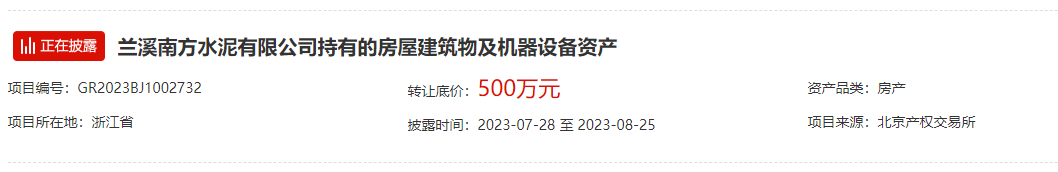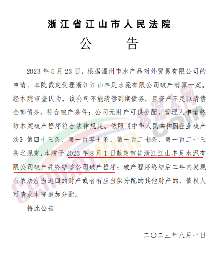 8月1日浙江省江山市人民法院發(fā)布公告稱,2023年5月23日,根據(jù)溫州市水產(chǎn)品對(duì)外貿(mào)易有限公司的申請(qǐng),裁定受理浙江江山豐足水泥有限公司破產(chǎn)清算一案。