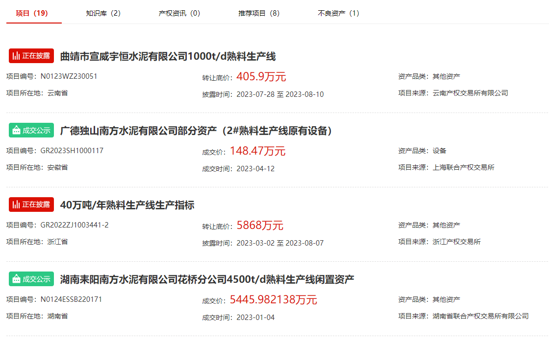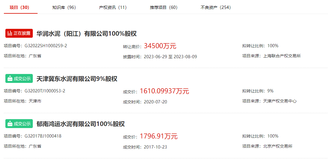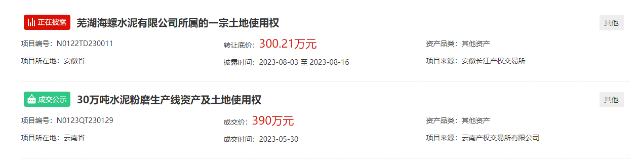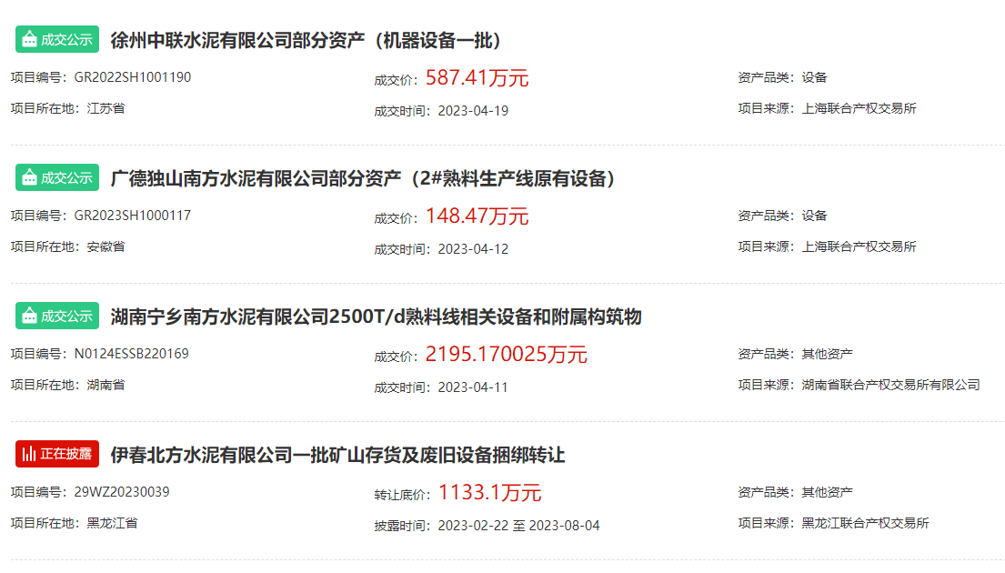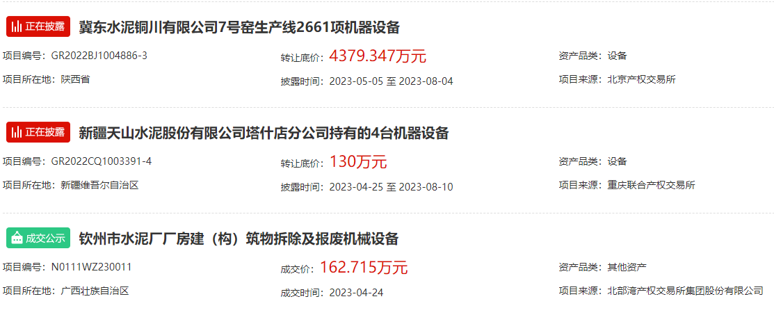 另有包含華潤(rùn)水泥、冀東水泥、萬(wàn)年青水泥在內(nèi)的4家品牌企業(yè)公開出讓企業(yè)股權(quán);包含行業(yè)知名企業(yè)蕪湖海螺水泥在內(nèi)的兩家企業(yè)公開出讓土地使用權(quán);包含天山水泥、中聯(lián)水泥、南方水泥、北方水泥、冀東水泥在內(nèi)的14家企業(yè)公開出讓熟料生產(chǎn)線、熟料指標(biāo)、房屋建筑物、構(gòu)筑物及機(jī)器設(shè)備等資產(chǎn)。