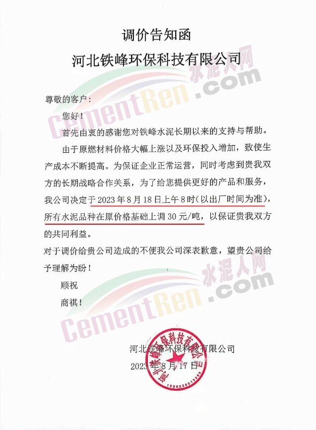 河北鐵峰環??萍加邢薰就ㄖQ,由于原燃材料價格大幅上漲以及環保投入增加,致使生產成本不斷提高。為保證企業正常運營,決定于2023年8月18日上午8時,所有水泥品種在原價格基礎上調30元/噸。