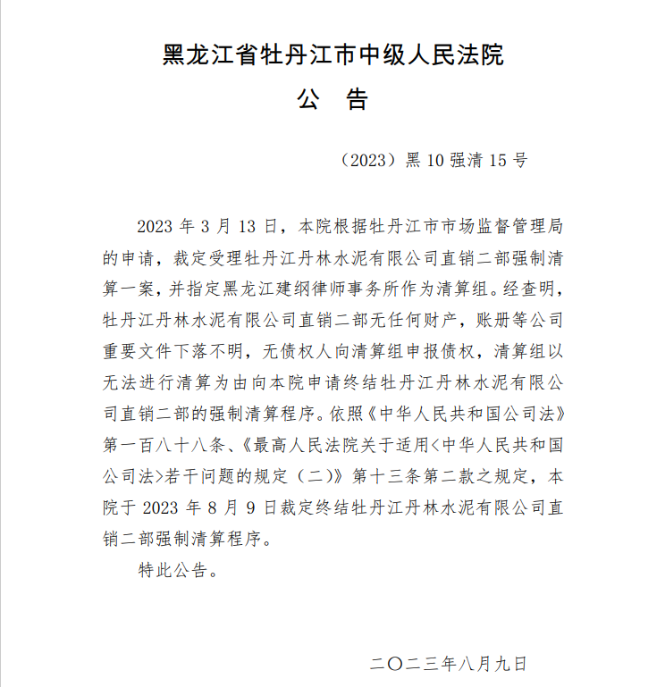 8月9日,黑龍江省牡丹江市中級人民法院公告,經查明,牡丹江丹林水泥有限公司直銷二部無任何財產,賬冊等公司重要文件下落不明,無債權人向清算組申報債權,清算組以無法進行清算為由向本院申請終結牡丹江丹林水泥有限公司直銷二部的強制清算程序,本院裁定終結牡丹江丹林水泥有限公司直銷二部強制清算程序。