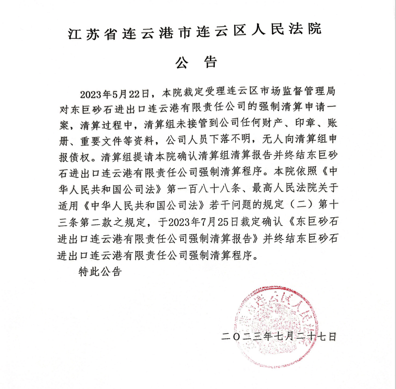 7月27日,江蘇省連云港市連云區人民法院公告,2023年5月22日,本院裁定受理連云區市場監督管理局對東巨砂石進出口連云港有限責任公司的強制清算申請一案,清算過程中,清算組未接管到公司任何財產、印章、賬冊、重要文件等資料,公司人員下落不明,無人向清算組申報債權。清算組提請本院確認清算組清算報告并終結東巨砂石進出口連云港有限責任公司強制清算程序。本院于2023年7月25日裁定確認《東巨砂石進出口連云港有限責任公司強制清算報告》并終結東巨砂石進出口連云港有限責任公司強制清算程序。