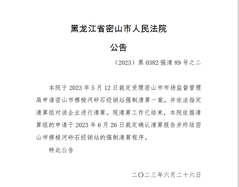 6月26日,黑龍江省密山市人民法院公告,本院于2023年5月12日裁定受理密山市市場監督管理局申請密山市穆棱河砂石經銷站強制清算一案,并依法指定清算組對該企業進行清算?,F清算工作已結束,本院依據清算組的申請于 2023年6月26日裁定確認清算報告并終結密山市穆棱河砂石經銷站的強制清算程序。