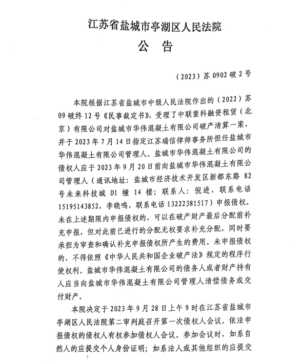 8月6日,江蘇省鹽城市亭湖區人民法院公告,本院受理了中聯重科融資租賃(北京)有限公司對鹽城市華偉混凝有限公司破產清算一案,并于 2023 年7月14日指定江蘇瑞信律師事務所擔任鹽城市華偉混凝土有限公司管理人,決定于2023 年9月 28日上午9 時在江蘇省鹽城市亭湖區人民法院第二審判庭召開第一次債權人會議。