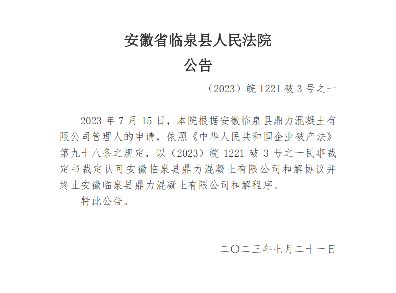 7月21日,安徽省臨泉縣人民法院公告,本院根據安徽臨泉縣鼎力混凝土有限公司管理人的申請,依照《中華人民共和國企業破產法》第九十八條之規定,以(2023)皖 1221 破 3 號之一民事裁定書裁定認可安徽臨泉縣鼎力混凝土有限公司和解協議并終止安徽臨泉縣鼎力混凝土有限公司和解程序.