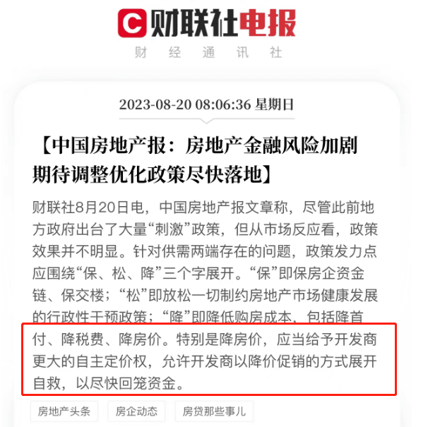 代表官方的中國房地產報發文稱:房地產金融風險加劇期待調整優化政策盡快落地。其中提到最重要的一點,應當給予開發商更大的自主定價權,允許開發商以降價促銷的方式展開自救,以盡快回籠資金。