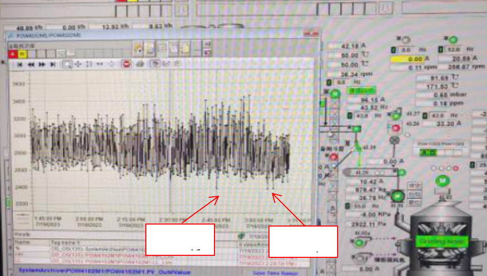 從生料磨磨況變化來看,保持喂料量、原材料配比、選粉機轉速、研磨壓力、循環風機轉速不變的情況下,生料助磨劑加入約10分鐘左右,生料磨主電機運行功率開始下降,生料磨壓差降低,生料磨振動下降,排渣提升機電流下降,出磨風溫升高,生料磨料層變薄,入庫提升機電流上升,生料磨產生的成品量增加,增加喂料量后逐漸恢復磨況;停止使用助磨劑后約10分鐘左右,生料磨主要參數出現與上述情況相反的變化,生料磨臺時產量明顯下降。