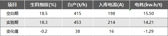 空白期與試驗期生料磨主要參數對比情況如上表所示,在系統操作參數、質量控制指標不做較大調整的情況下,使用生料助磨劑后,生料磨入庫斗提電流上升16A,臺時產量平均上升38t/h,噸生料電耗下降1.29 kwh/t,提產降耗效果達到預期。