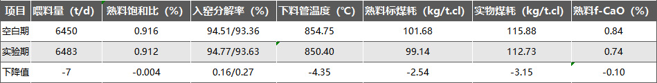空白期與試驗期回轉窯主要參數對比如上表所示,加入生料助磨劑后,控制窯產量、f-CaO基本不變的情況下,下調入窯生料溫度控制值,入窯生料分解率仍能滿足生產需求,相比空白期小幅增加,熟料實物煤耗下降3.15kg/t.cl,考慮到煤質變化影響,折算標煤耗下降約2.54kg/t.cl,節煤效果達到預期。