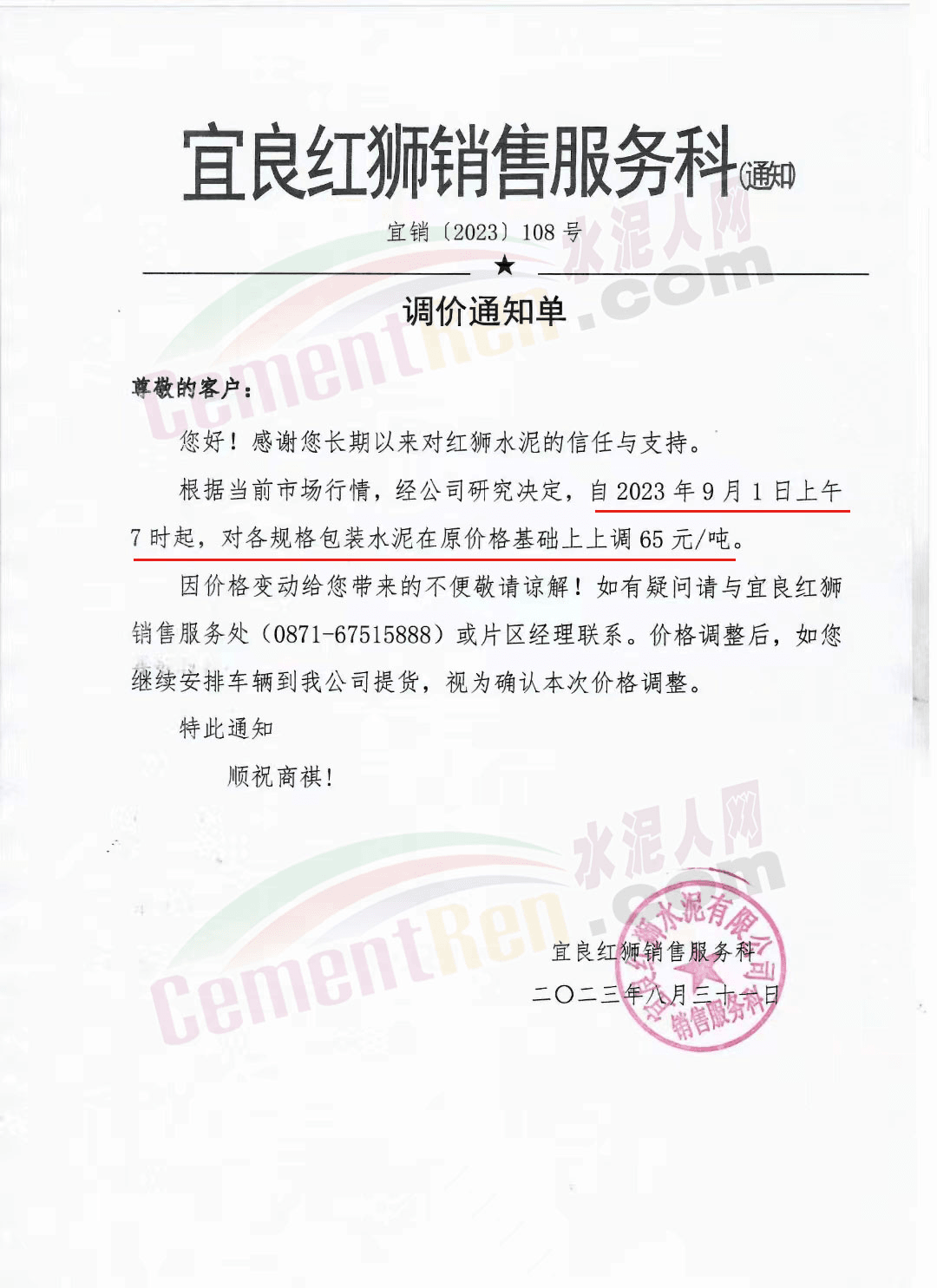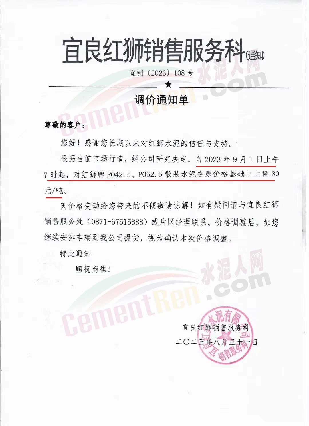 宜良紅獅銷售服務(wù)科通知,根據(jù)當(dāng)前市場行情,經(jīng)公司研究決定自2023年9月1日上午7時(shí)起,對各規(guī)格包裝水泥在原價(jià)格基礎(chǔ)上上調(diào)65元/噸。對紅獅牌PO42.5、PO52.5散裝水泥在原價(jià)格基礎(chǔ)上上調(diào)30元/噸。