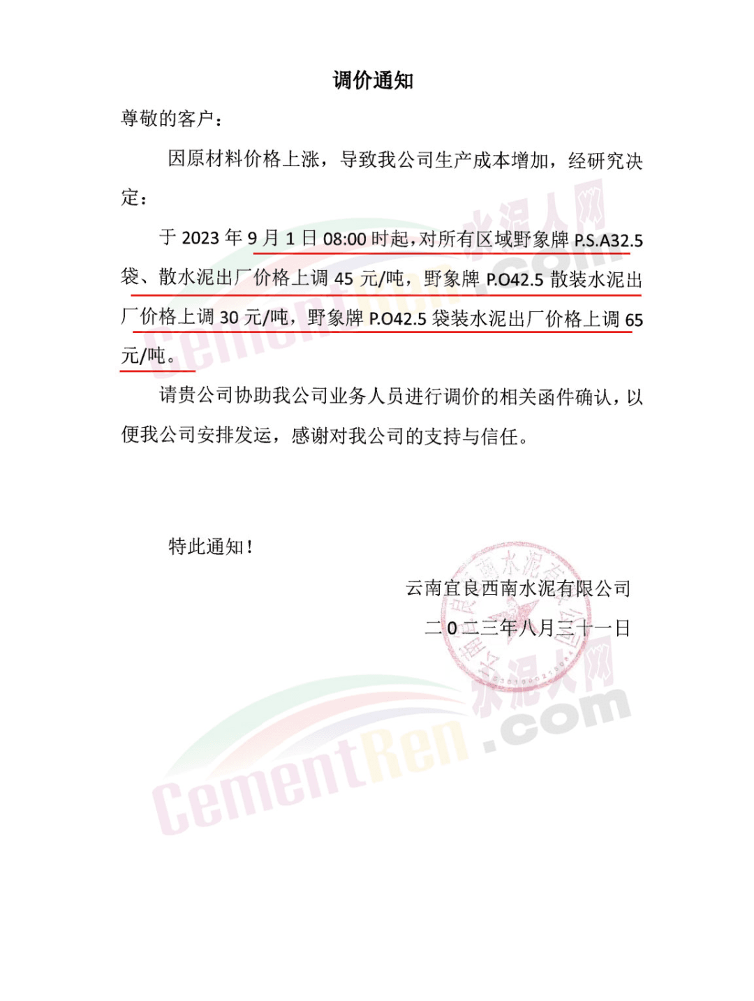 云南宜良西南水泥有限公司通知,因原材料價(jià)格上漲,導(dǎo)致公司生產(chǎn)成本增加,經(jīng)研究決定:于2023年9月1日8時(shí)起對所有區(qū)域野象牌PSA32.5袋、散水泥出廠價(jià)格上調(diào)45元/噸,野象牌PO42.5散裝水泥出廠價(jià)格上調(diào)30元/噸,野象牌PO42.5袋裝水泥出廠價(jià)格上調(diào)65元/噸。