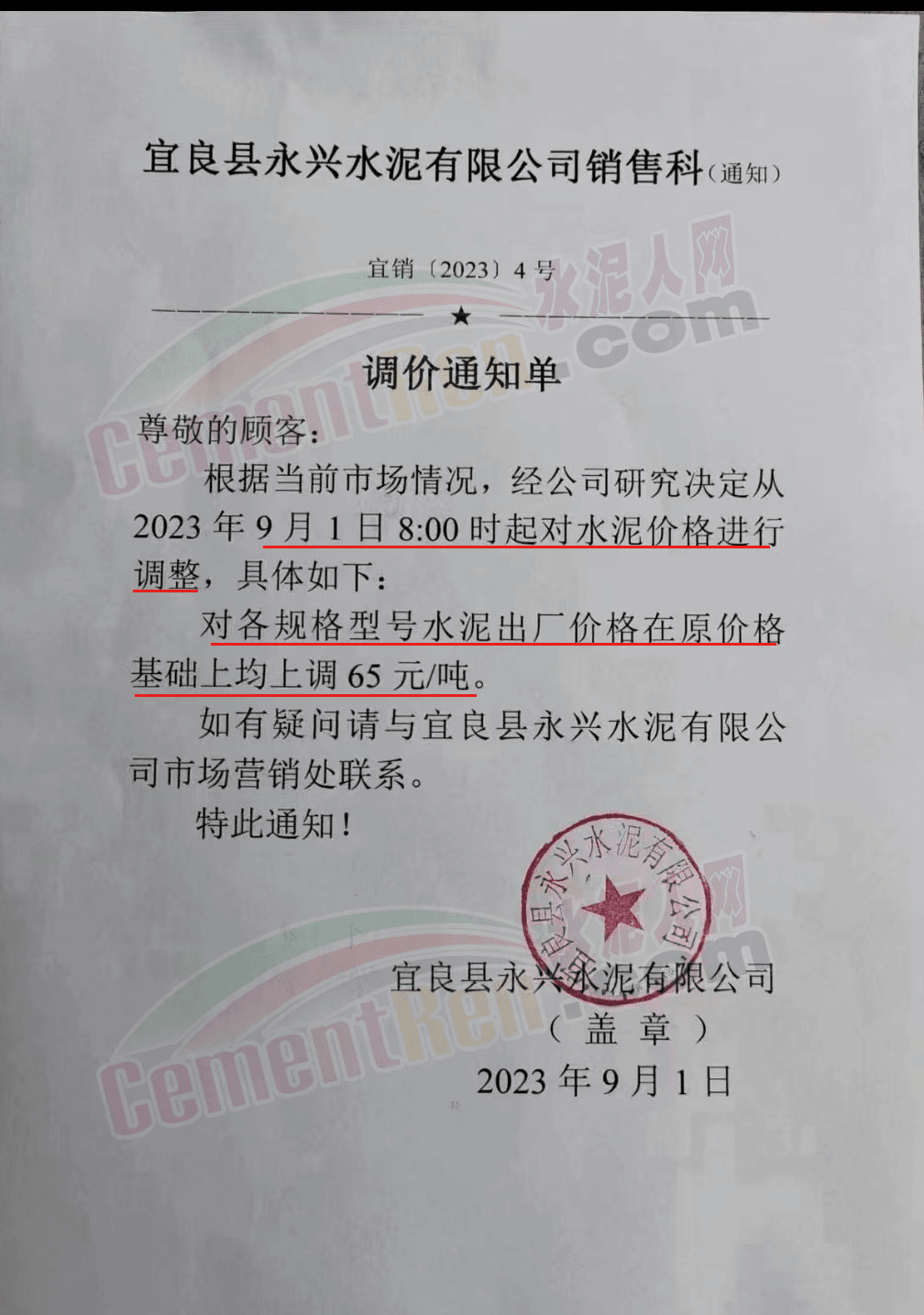 宜良縣永興水泥有限公司通知,根據(jù)當(dāng)前市場情況,經(jīng)公司研究決定從2023年9月1日8時(shí)起對各規(guī)格型號水泥出廠價(jià)格在原價(jià)格基礎(chǔ)上均上調(diào)65元/噸。