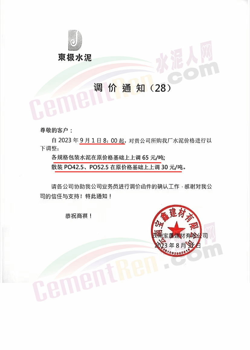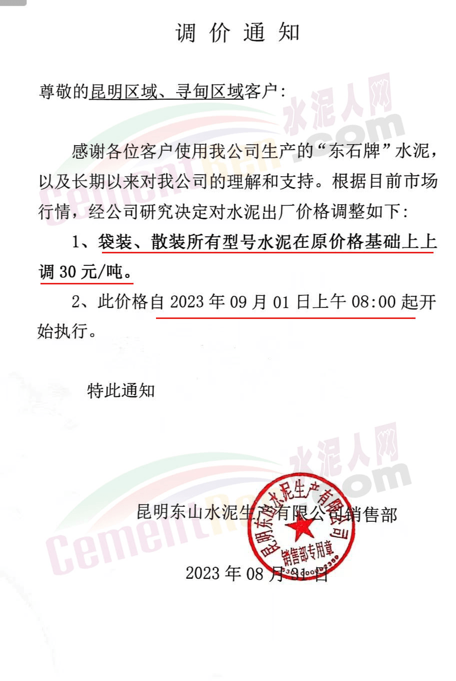 昆明東山水泥生產(chǎn)有限公司銷售部通知,根據(jù)目前市場行情,經(jīng)公司研究決定自2023年9月1日上午8時(shí)起對袋裝、散裝所有型號水泥在原價(jià)格基礎(chǔ)上上調(diào)30元/噸。