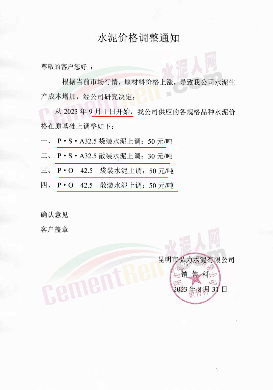 昆明市弘力水泥有限公司通知,根據(jù)當(dāng)前市場行情,原材料價(jià)格上漲,導(dǎo)致公司水泥生產(chǎn)成本增加,經(jīng)公司研究決定從2023年9月1日開始,公司供應(yīng)的P·S·A32.5袋裝水泥上調(diào)50元/噸,P·S·A32.5散裝水泥上調(diào)30元/噸;P·042.5袋裝水泥上調(diào)50元/噸,P·O42.5散裝水泥上調(diào)50元/噸。
