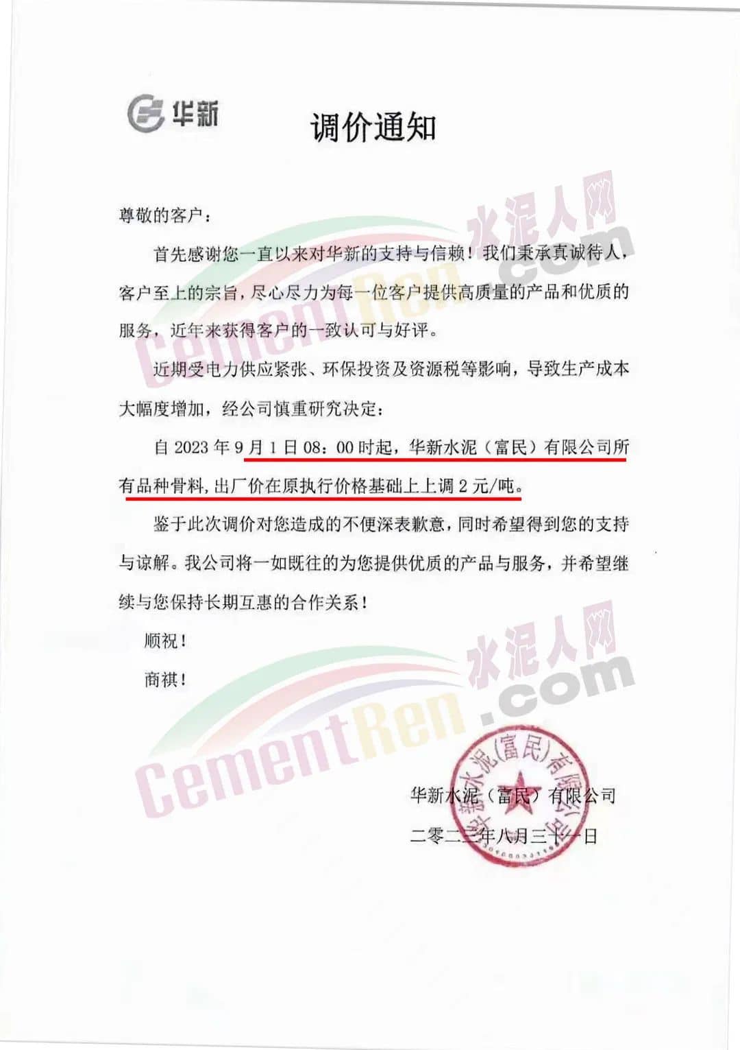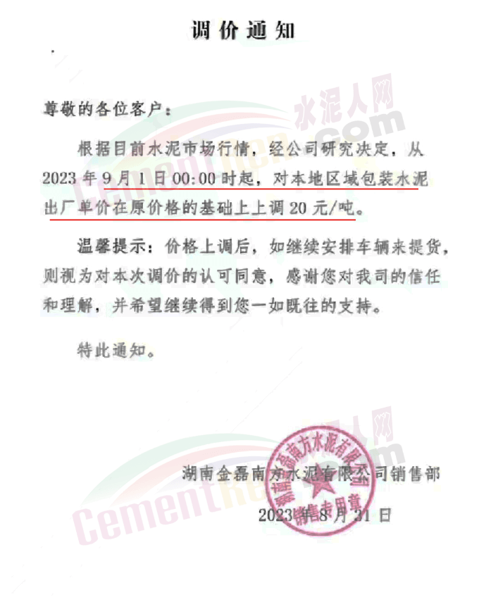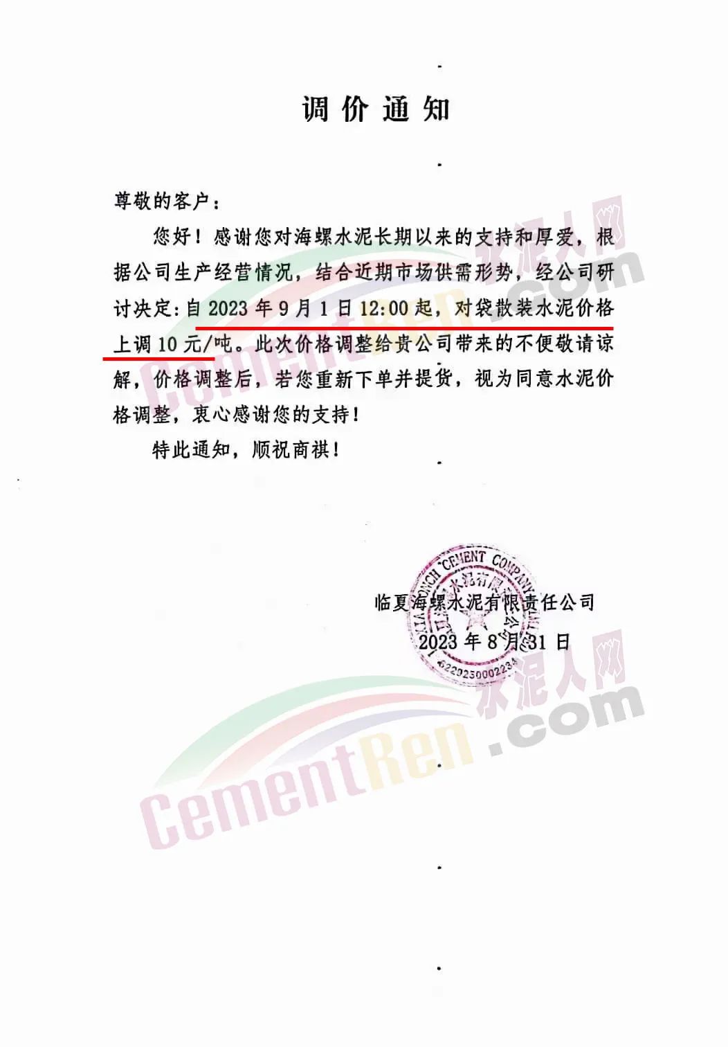 臨夏海螺水泥有限責(zé)任公司通知,根據(jù)公司生產(chǎn)經(jīng)營情況,結(jié)合近期市場供需形勢,經(jīng)公司研討決定:自2023年9月1日12時(shí)起,對袋散裝水泥價(jià)格上調(diào)10元/噸。