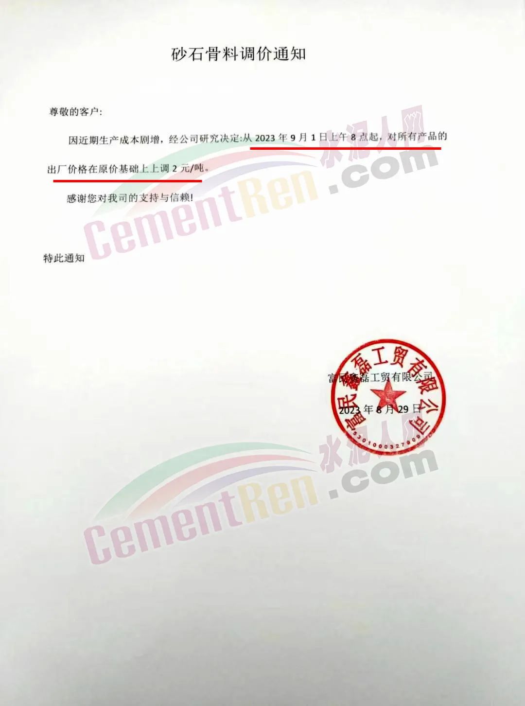 區(qū)域內(nèi)主要品牌水泥企業(yè)除上調(diào)水泥價(jià)格外,還同步上調(diào)了骨料報(bào)價(jià)。華新水泥(富民)有限公司通知稱,近期受電力供應(yīng)緊張、環(huán)保投資及資源稅等影響,導(dǎo)致生產(chǎn)成本大幅度增加,經(jīng)公司慎重研究決定:自2023年9月1日8時(shí)起,華新水泥(富民)有限公司所有品種骨料,出廠價(jià)在原執(zhí)行價(jià)格基礎(chǔ)上上調(diào)2元/噸。
