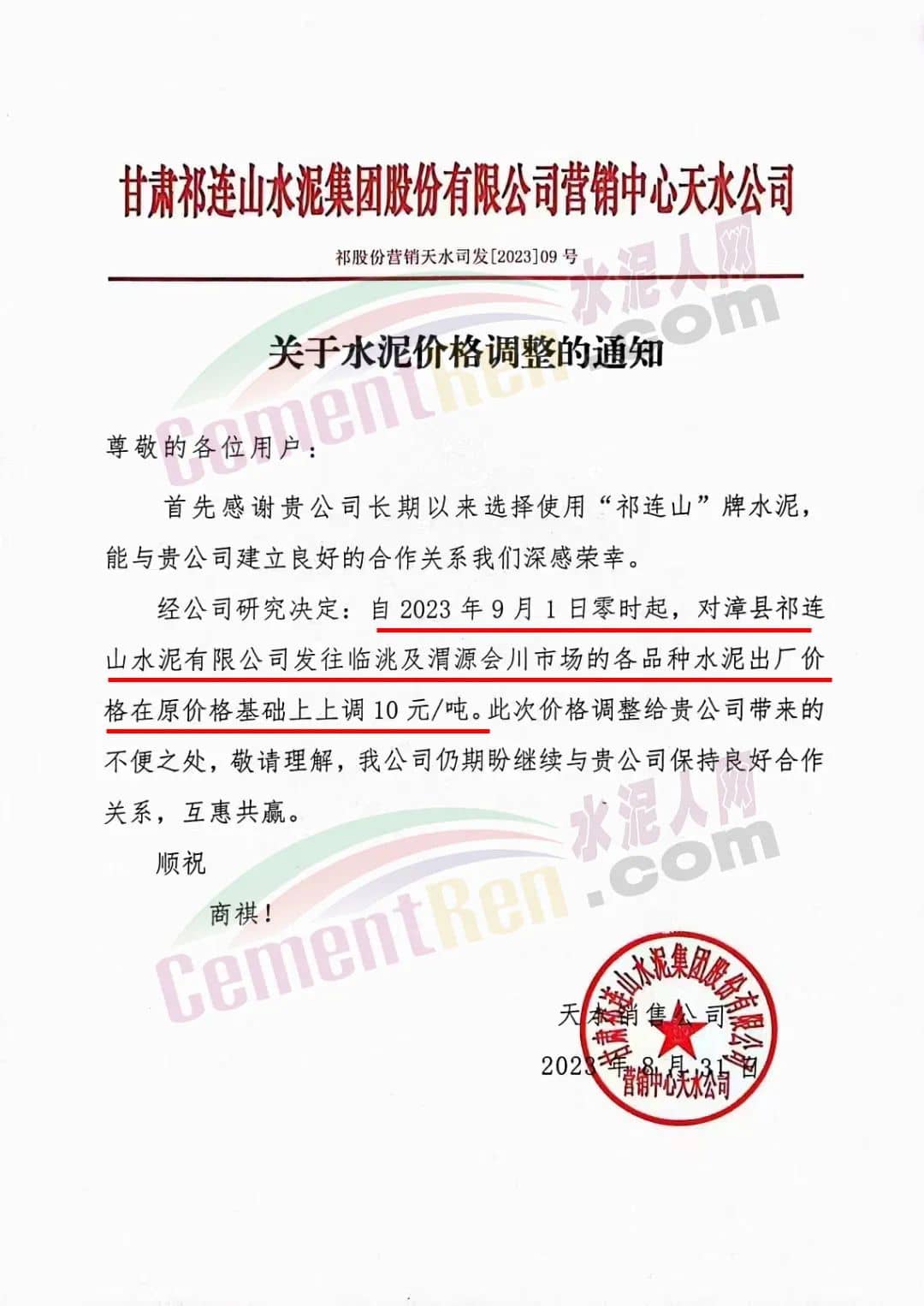 甘肅祁連山水泥集團(tuán)股份有限公司營銷中心天水公司通知,經(jīng)公司研究決定:自2023年9月1日零時(shí)起,對漳縣祁連山水泥有限公司發(fā)往臨洮及渭源會(huì)川市場的各品種水泥出廠價(jià)格在原價(jià)格基礎(chǔ)上上調(diào)10元/噸。