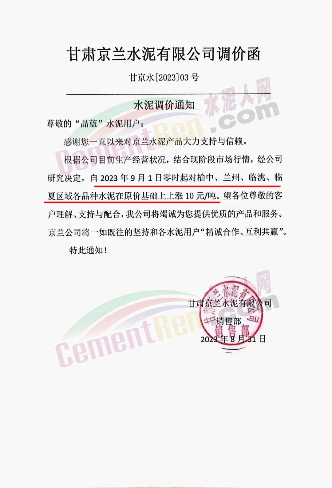 甘肅京蘭水泥有限公司通知,根據(jù)公司目前生產(chǎn)經(jīng)營狀況,結(jié)合現(xiàn)階段市場行情,經(jīng)公司研究決定,自2023年9月1日零時(shí)起對榆中、蘭州、臨洮、臨夏區(qū)域各品種水泥在原價(jià)基礎(chǔ)上上漲10元/噸。