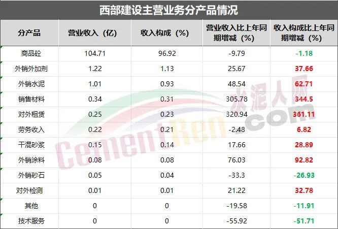 今年上半年,西部建設仍以預拌混凝土生產為核心,輻射水泥、外加劑、商品砂漿、砂石骨料、物流運輸、技術研發與服務、檢測、資源綜合利用、電子商務等業務,基本建立了“技術研發+資源儲備+生產+銷售+服務”的產業鏈條。同時,外銷外加劑、外銷水泥、銷售材料、對外租賃等業務板塊營業收入及收入構成同比去年均有所增長。
