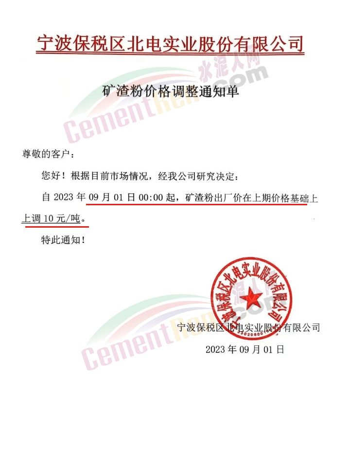 浙江寧波保稅區北電實業股份有限公司通知,根據目前市場情況,經公司研究決定:自9月1日0時起,礦渣粉出廠價在上期價格基礎上上調10元/噸,上調后礦粉現金掛牌價210元/噸。