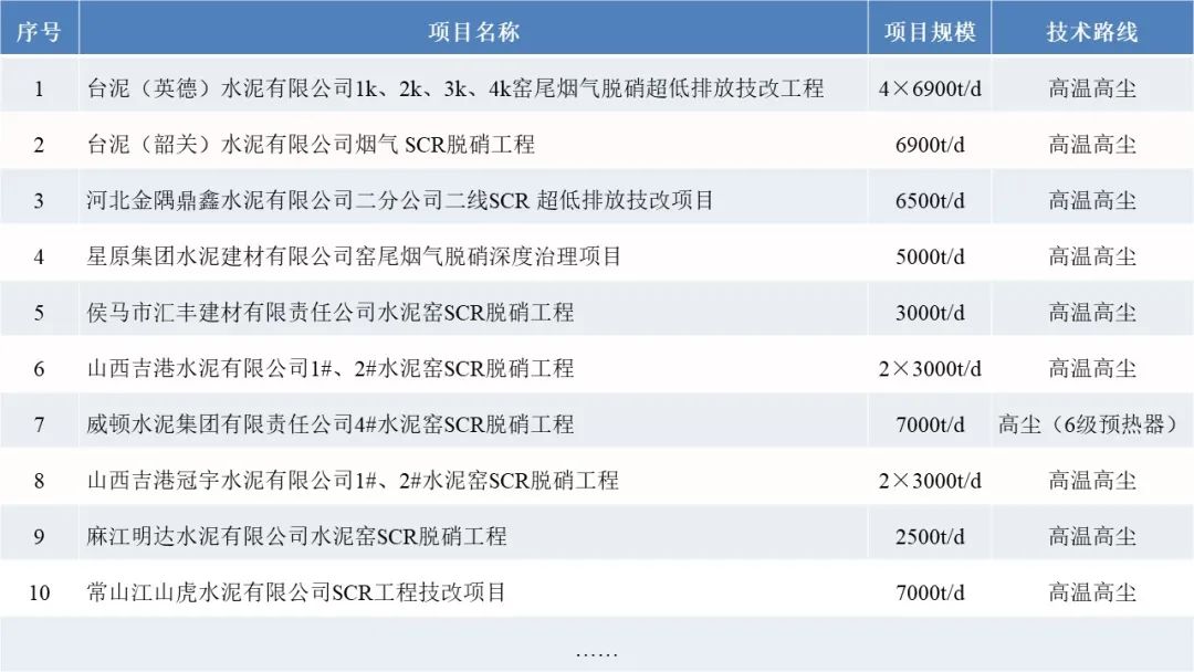 水泥窯高溫高塵煙氣SCR脫硝業績表(部分)