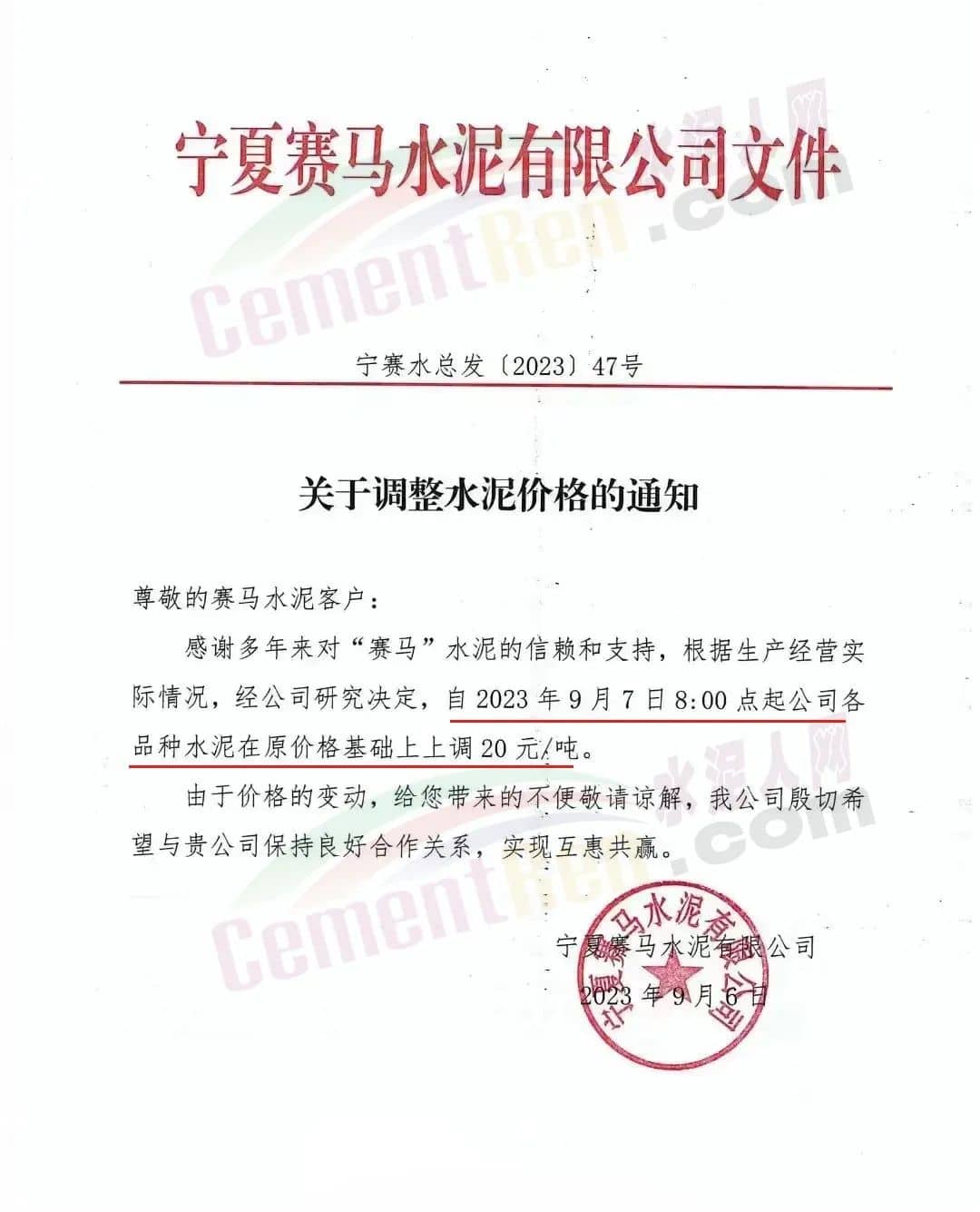 寧夏瀛海天琛建材有限公司通知,根據(jù)公司實際經(jīng)營情況,公司決定,自2023年9月7日零點起,各品種水泥在原價格基礎(chǔ)上上調(diào)20元/噸。