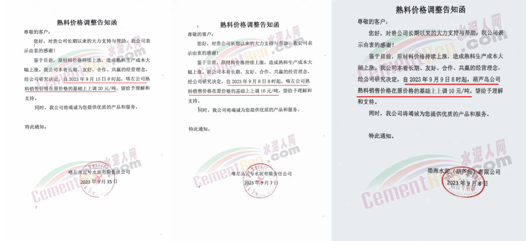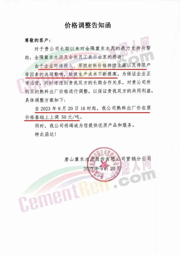 唐山冀東水泥股份有限公司營銷分公司通知,由于企業(yè)環(huán)保投入、原燃材料價格持續(xù)上漲以及停限產(chǎn)等因素的共同影響,致使生產(chǎn)成本不斷提高。為保證企業(yè)正常運營,自2023年9月20日16時起,熟料出廠價在原價格基礎上上調(diào)50元/噸。