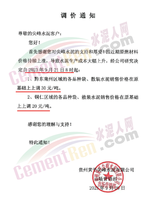 貴州黃平尖峰水泥通知,因近期原燃材料價格持續(xù)上漲,導致水泥生產(chǎn)成本大幅上升,經(jīng)公司研究決定自2023年9月21日8時起,黔東南州區(qū)域的各品種袋、散裝水泥銷售價格在原基礎上上調(diào)30元/噸。銅仁區(qū)域的各品種袋、散裝水泥銷售價格在原基礎上上調(diào)20元/噸。
