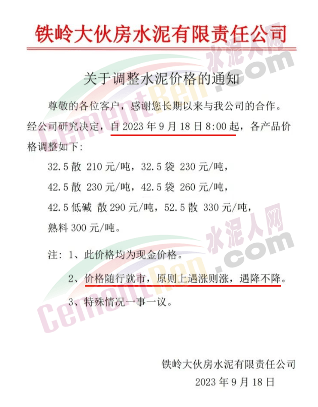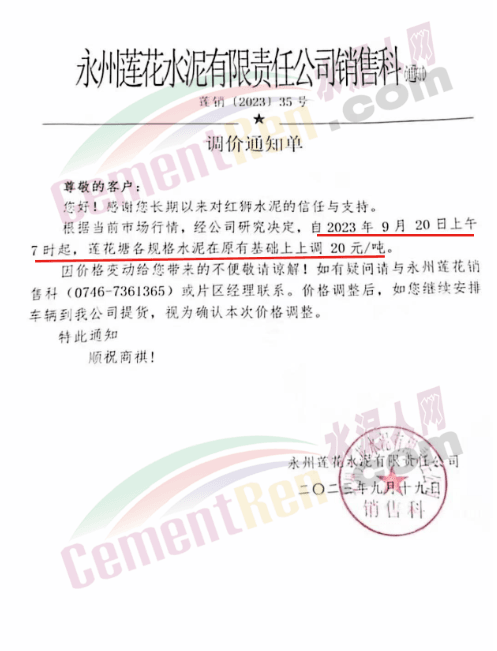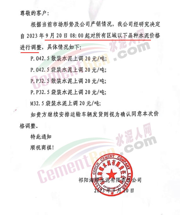 祁陽海螺水泥通知,根據(jù)當前市場形勢及公司產(chǎn)銷情況,經(jīng)研究決定自2023年9月20日8:00起對所有區(qū)域各品種水泥價格上調(diào)20元/噸。