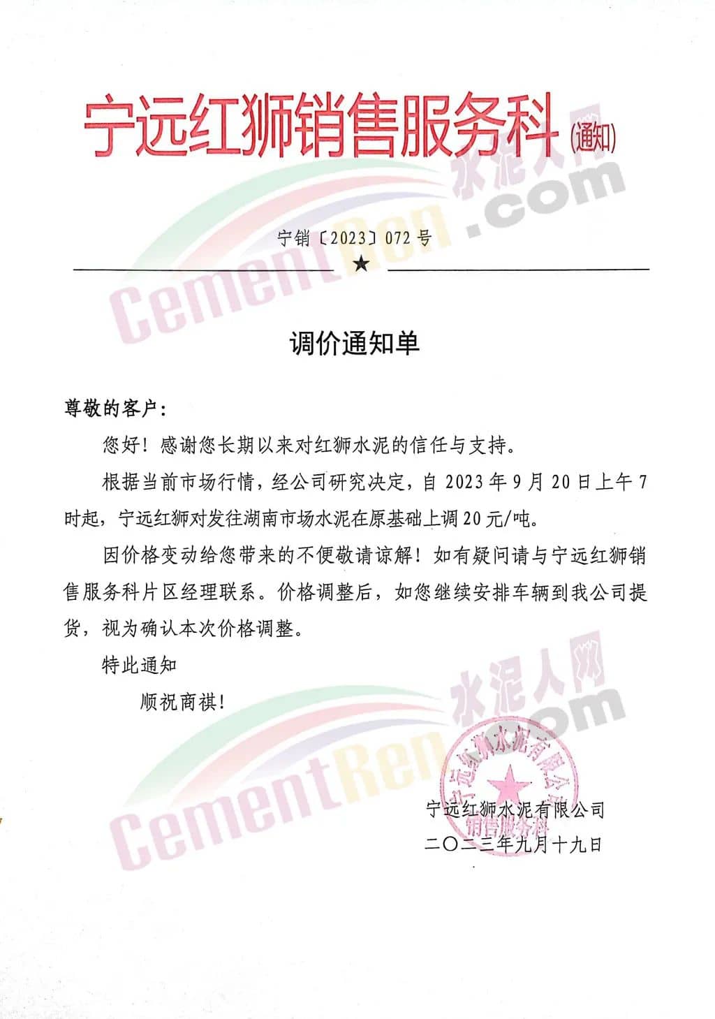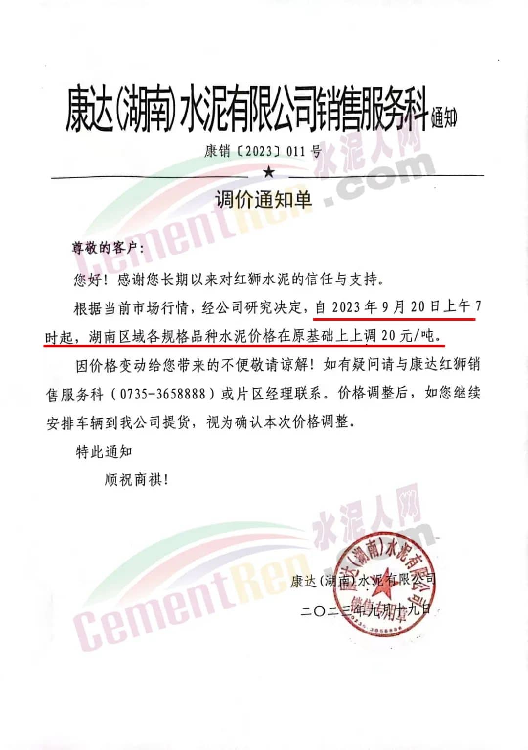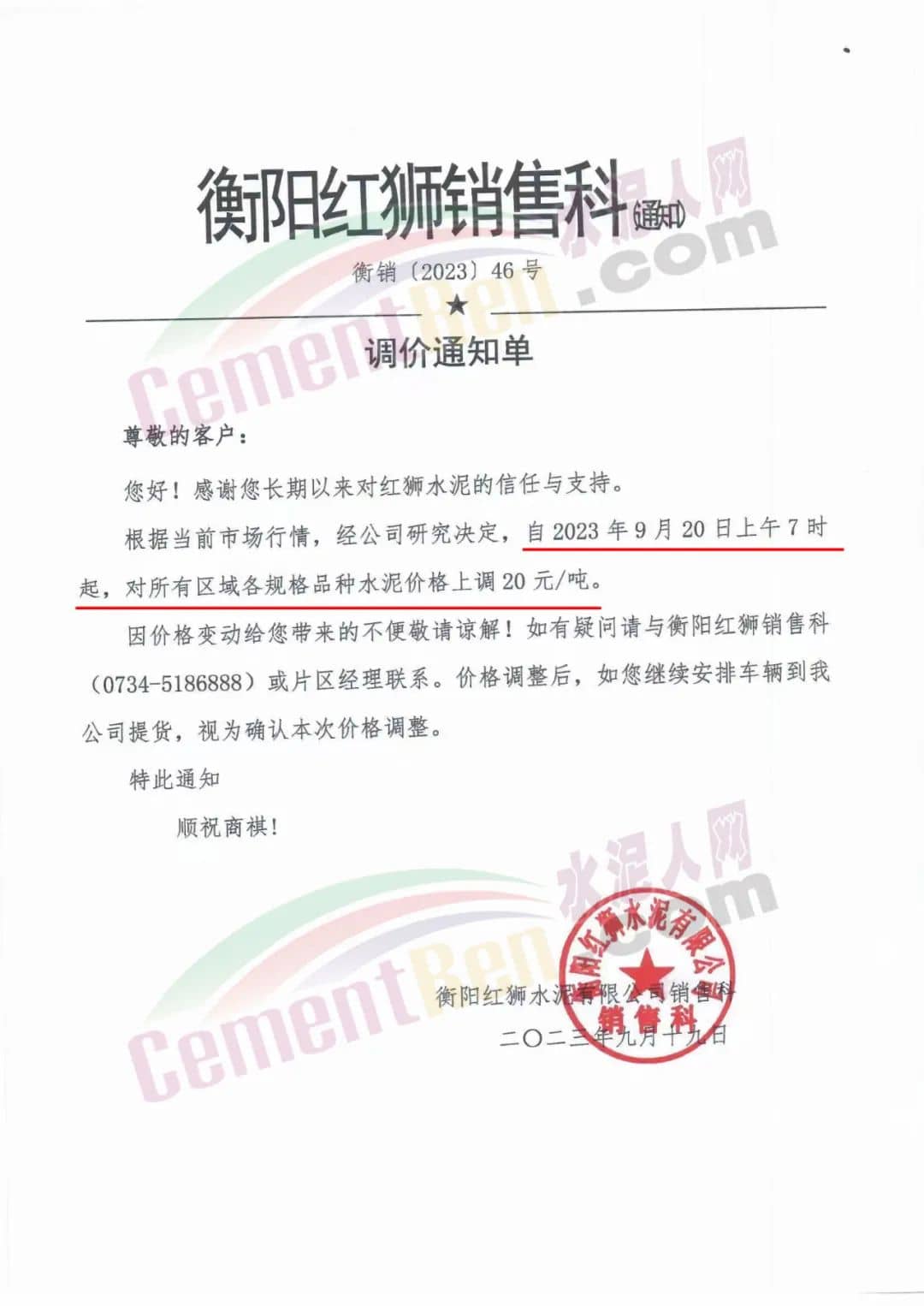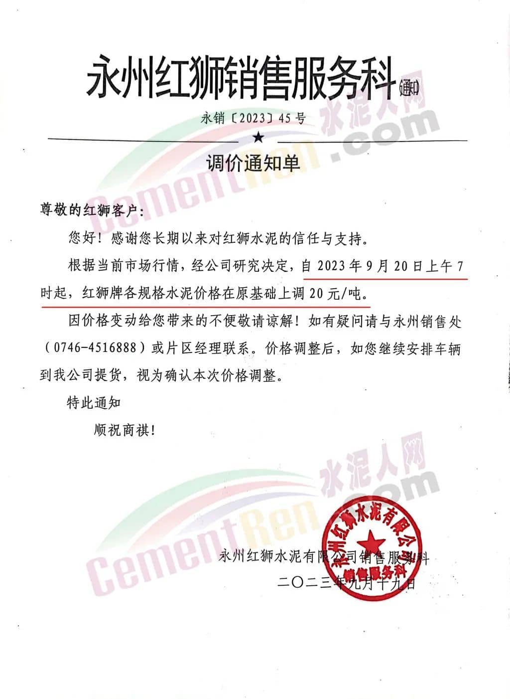 紅獅水泥旗下永州紅獅、寧遠紅獅、衡陽紅獅、永州蓮花水泥、康達(湖南)水泥等多家企業(yè)通知,根據(jù)當前市場行情,經(jīng)公司研究決定,自2023年9月20日上午7時起各規(guī)格水泥價格在原基礎上上調(diào)20元/噸。