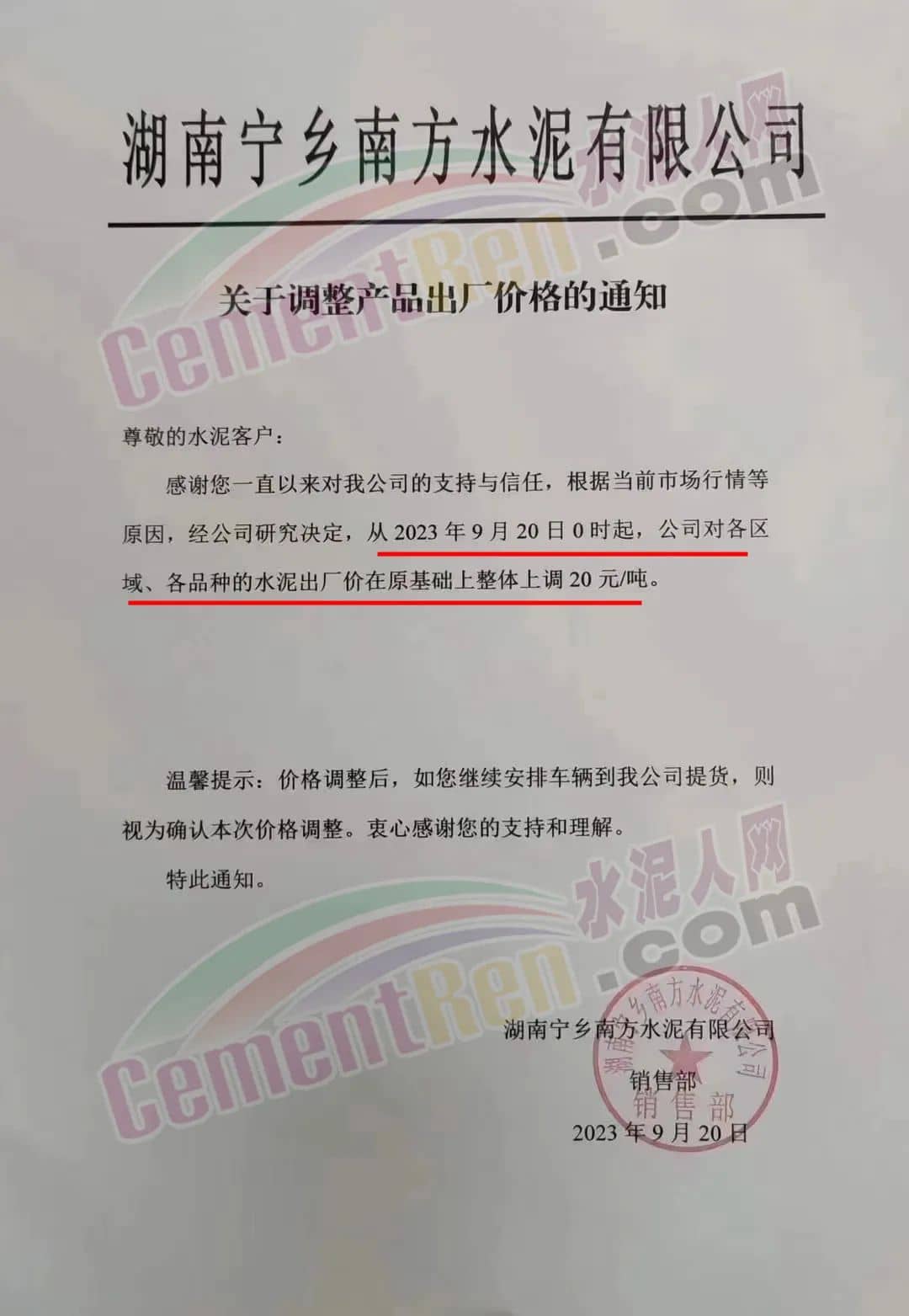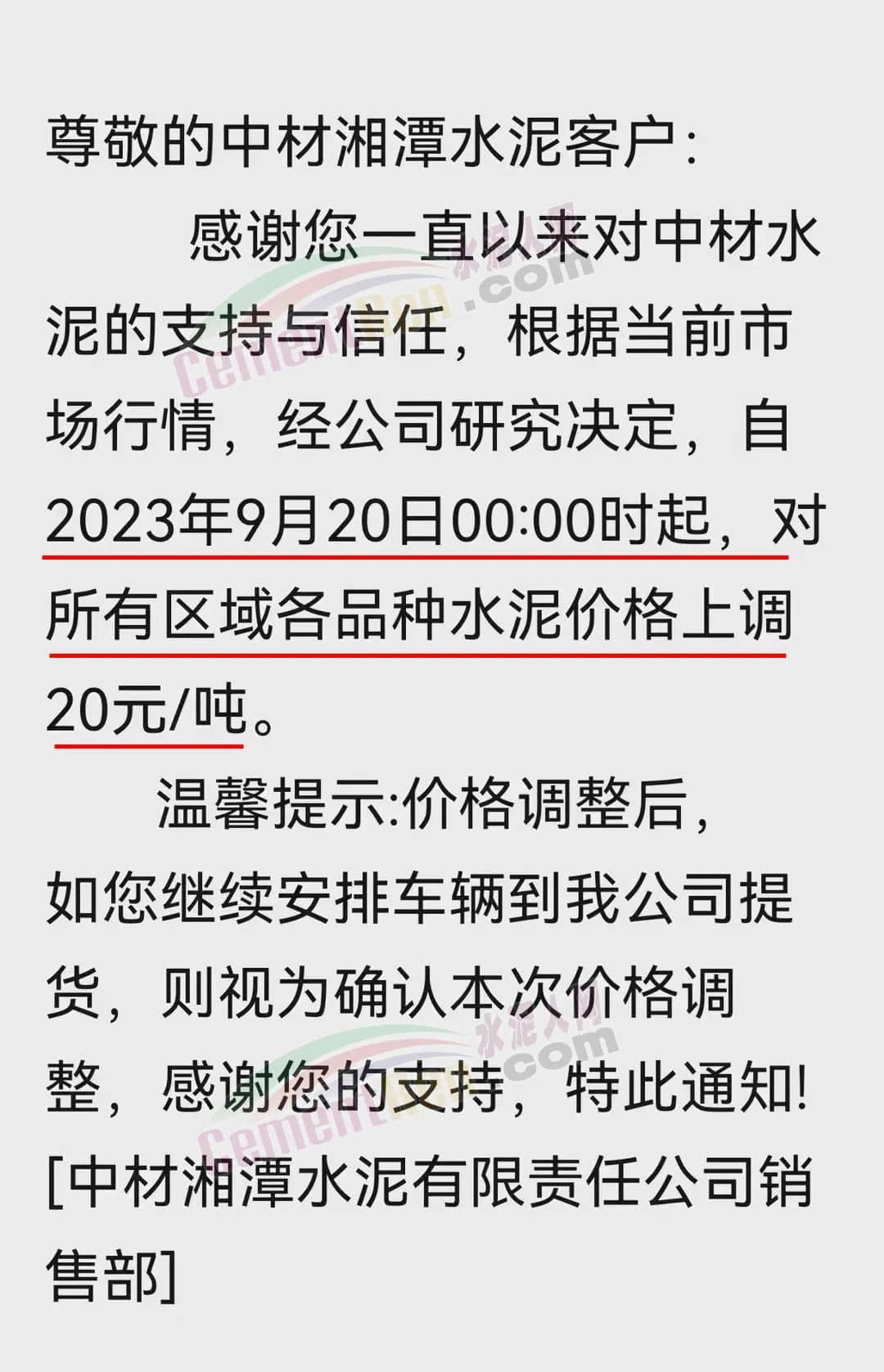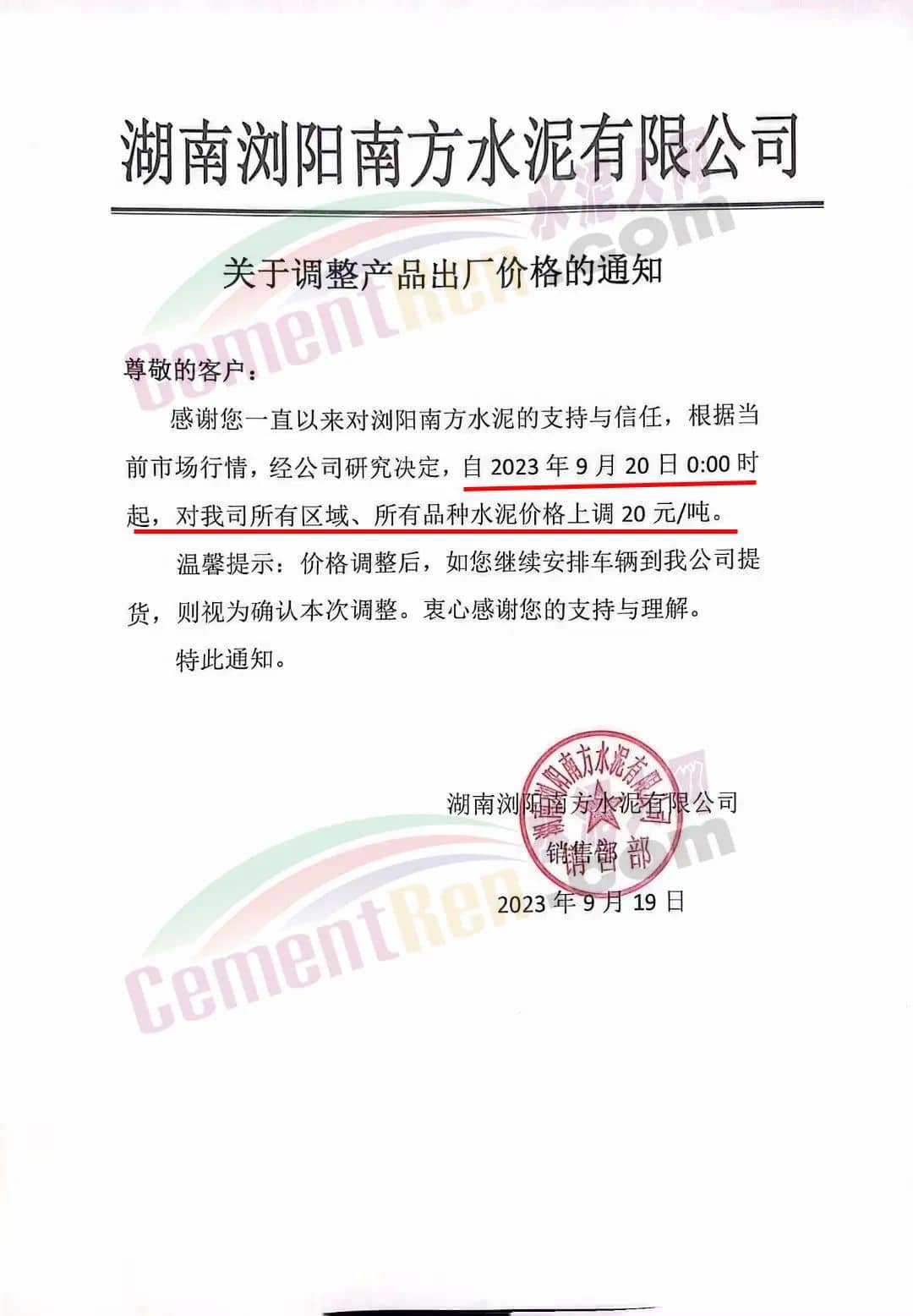 中南水泥旗下耒陽南方、寧鄉(xiāng)南方、瀏陽南方、桃江南方、坪塘南方、韶峰南方、中材湘潭水泥等多家企業(yè)通知,根據(jù)當前市場行情,經(jīng)公司研究決定,從2023年9月20日0時起,對各區(qū)域、各品種的水泥出廠價在原基礎上上調(diào)20~40元/噸。