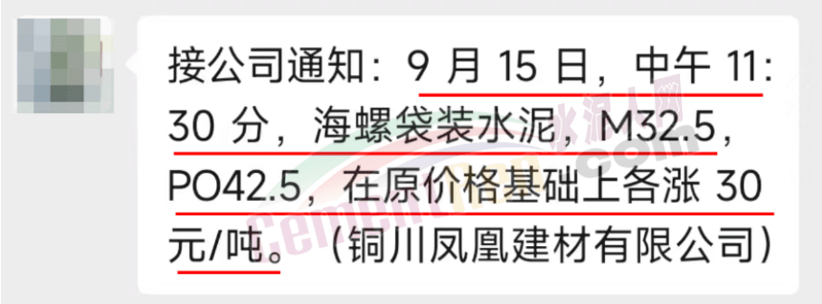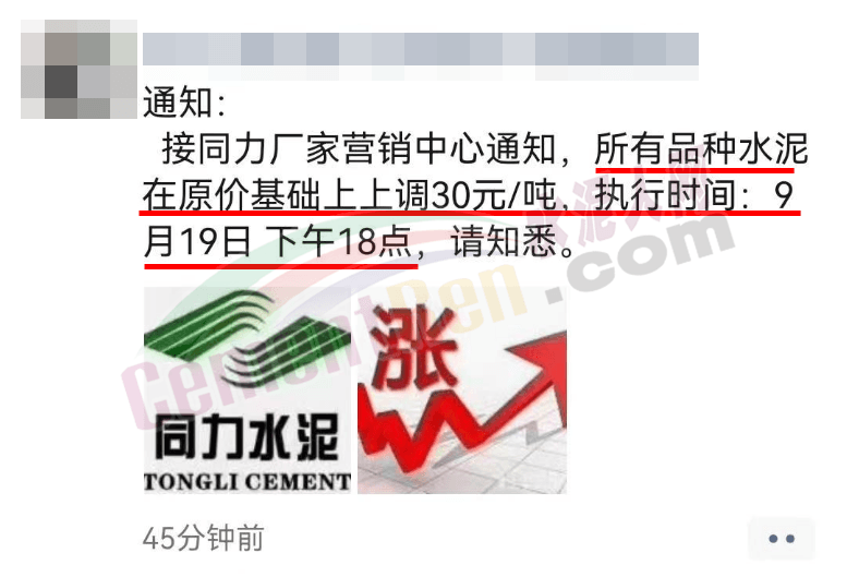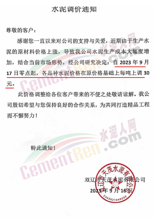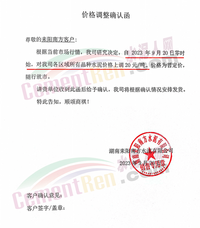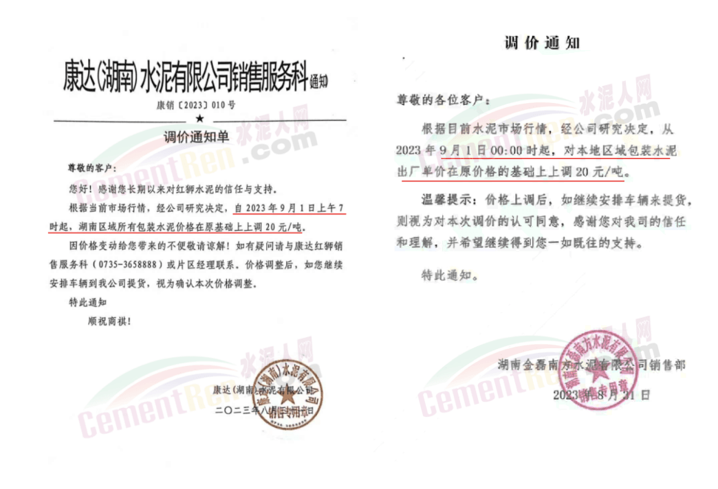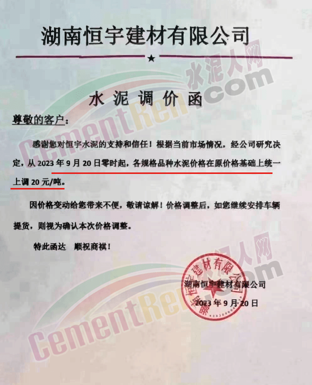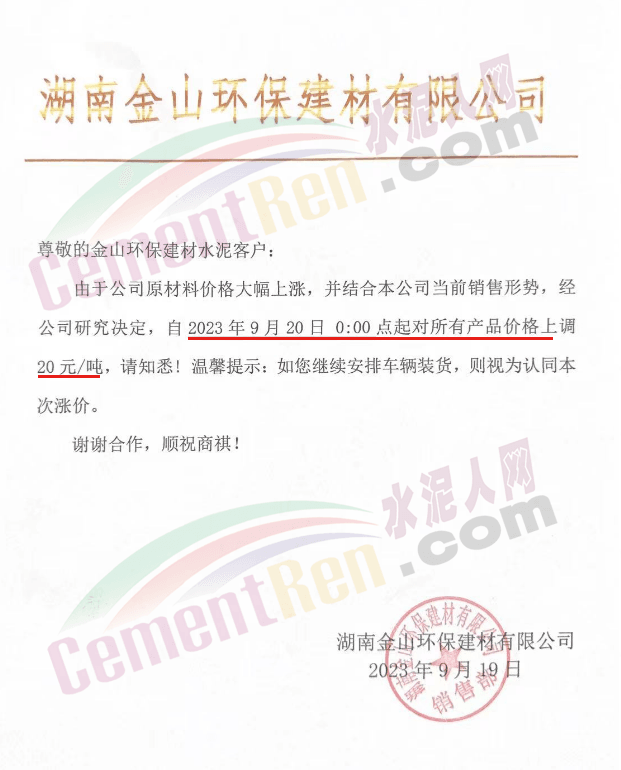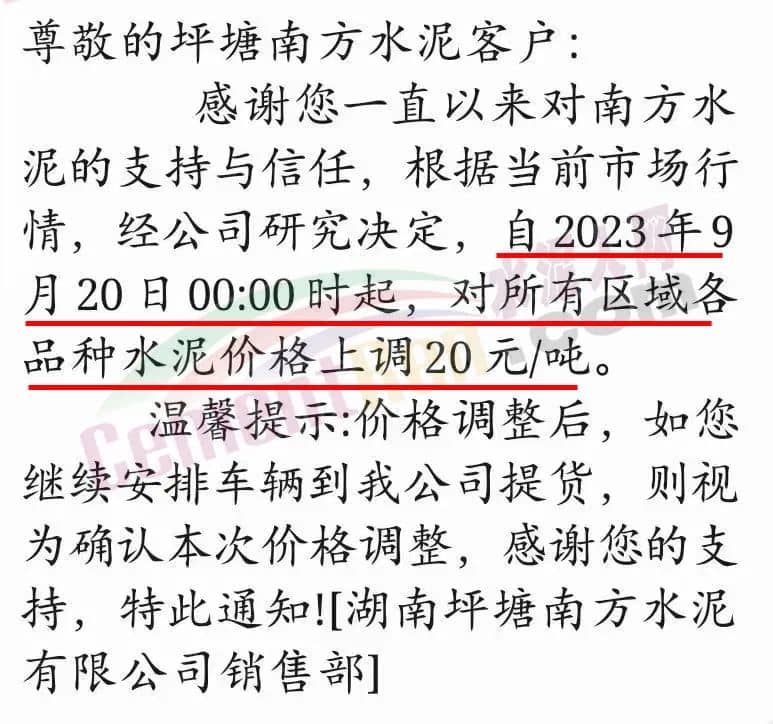中南水泥旗下耒陽南方、寧鄉(xiāng)南方、瀏陽南方、桃江南方、坪塘南方、韶峰南方、中材湘潭水泥等多家企業(yè)通知,根據(jù)當前市場行情,經(jīng)公司研究決定,從2023年9月20日0時起,對各區(qū)域、各品種的水泥出廠價在原基礎上上調(diào)20~40元/噸。