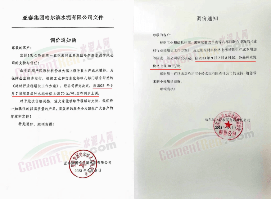 9月7日,亞泰集團哈爾濱水泥、哈爾濱小嶺水泥通知,各品種水泥價格上調(diào)70元/噸。