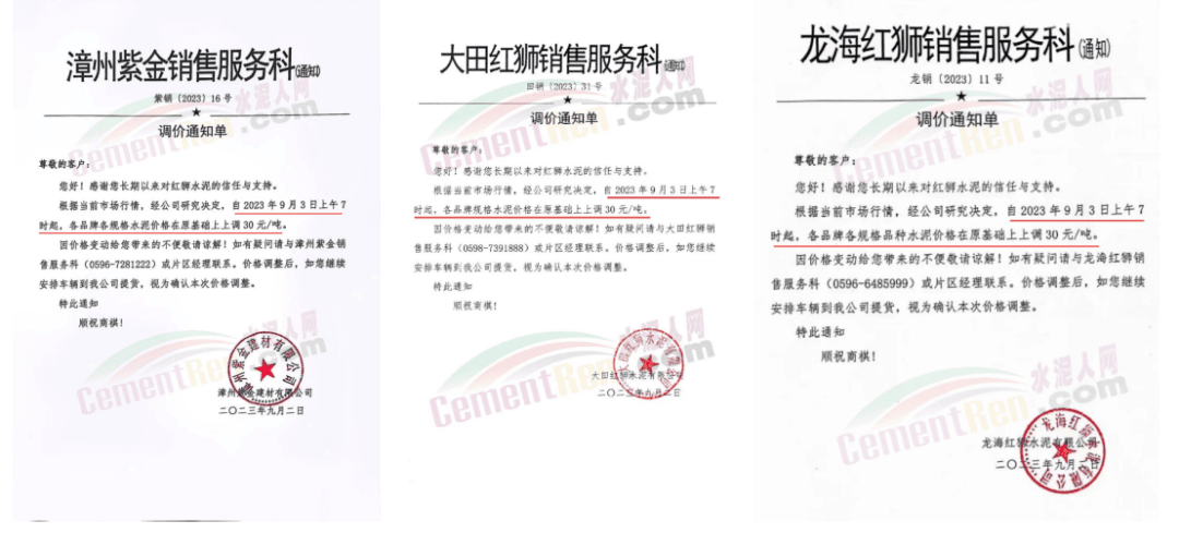 其中,紅獅水泥旗下漳州紫金水泥、龍海紅獅、大田紅獅銷售服務科通知,各品牌各規(guī)格品種水泥價格在原基礎上上調(diào)30元/噸。